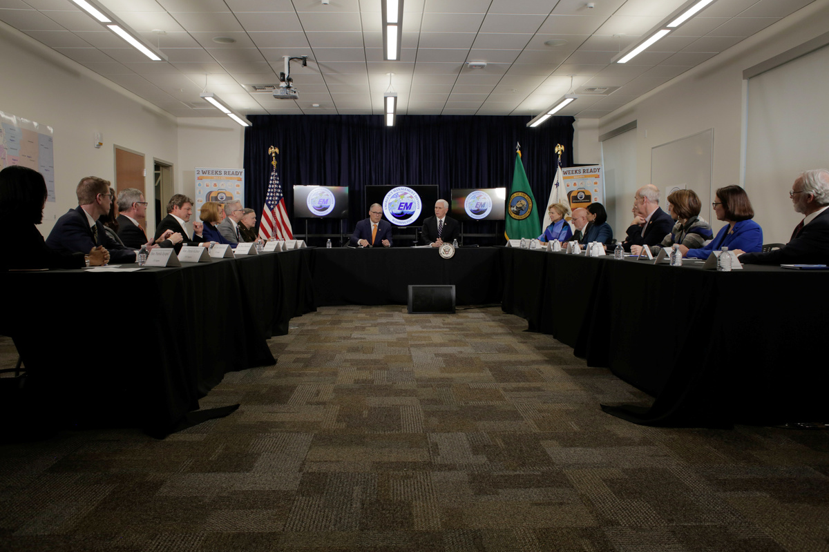 U.S. Vice President Mike Pence, who heads the government's coronavirus task force, speaks during a meeting with Governor Jay Inslee and others at the Pierce County Readiness Center at Camp Murray near Tacoma, Washington, U.S. March 5, 2020. REUTERS/David Ryder
