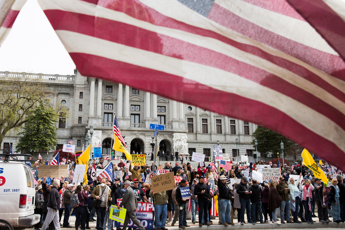 Demonstrators gather to protest against the state's extended stay-at-home order to help slow the spread of the coronavirus disease (COVID-19) in Harrisburg, Pennsylvania, U.S., April 20, 2020. REUTERS/Rachel Wisniewski