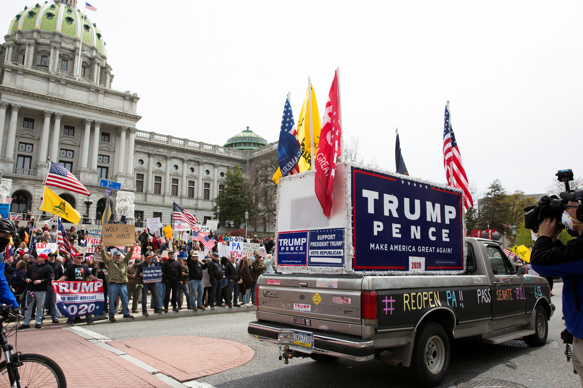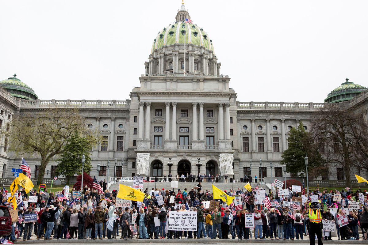In Pennsylvania, where Democratic Governor Tom Wolf has pledged to veto a bill in the Republican-led General Assembly that would force him to reopen some businesses, several hundred demonstrators, some in cars with horns blaring, rallied in the state capital, Harrisburg.