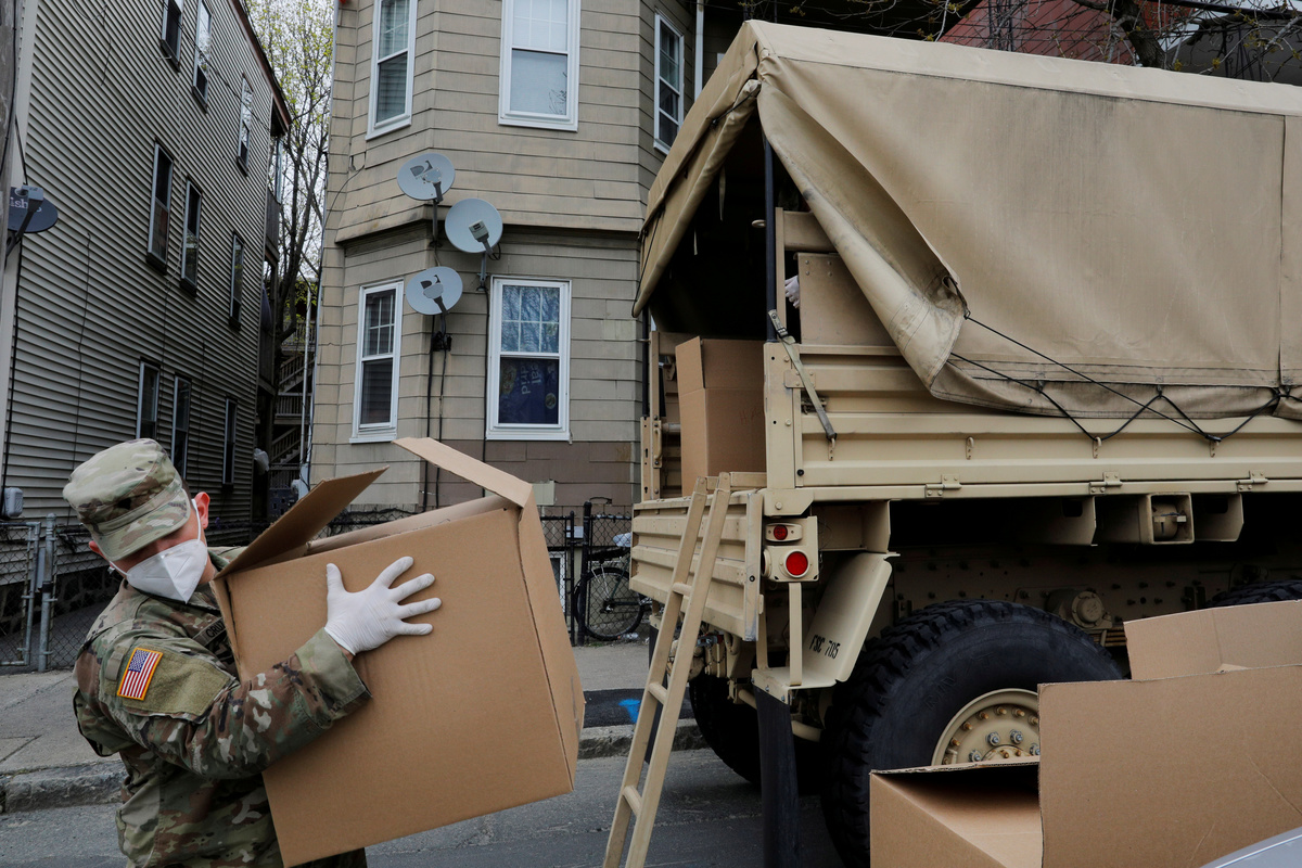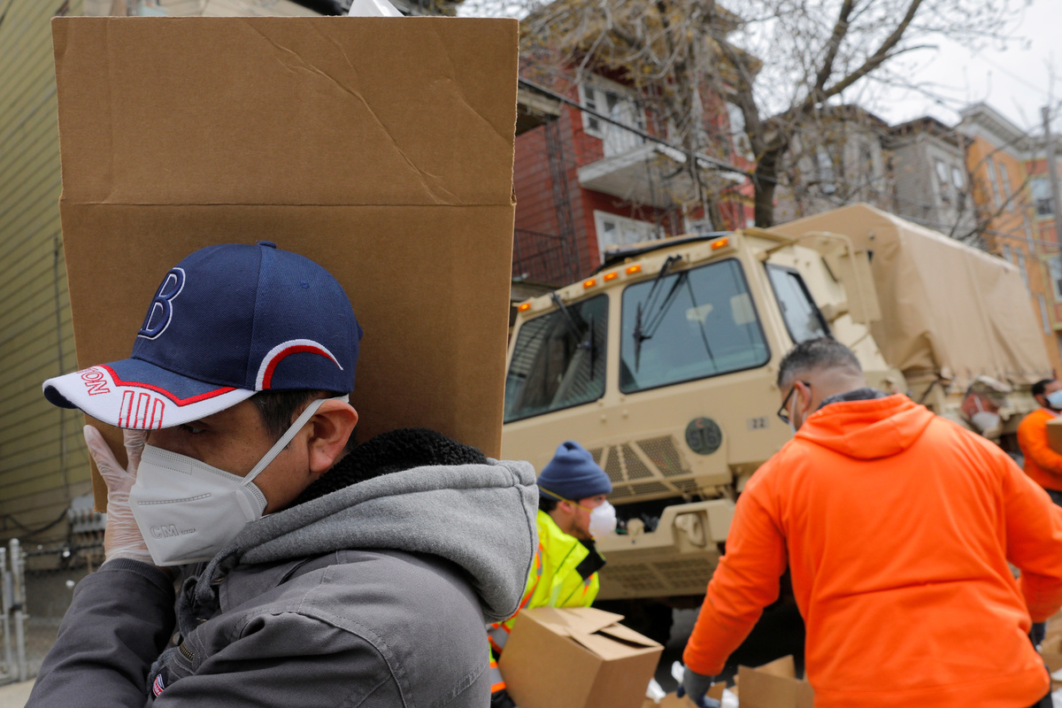 The FSC 101 Engineering Battalion of the Massachusetts Army National Guard unloads groceries to be distributed at a pop-up food pantry amid the coronavirus disease (COVID-19) outbreak in Chelsea, Massachusetts, U.S., April 20, 2020. REUTERS/Brian Snyder