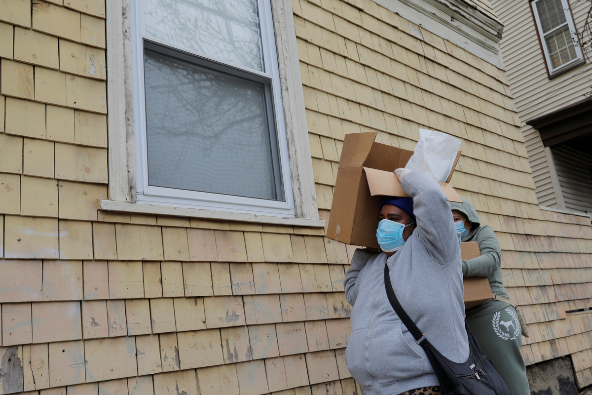 A resident wearing a protective face mask carries a box of groceries distributed by the FSC 101 Engineering Battalion of the Massachusetts Army National Guard at a pop-up food pantry amid the coronavirus disease (COVID-19) outbreak in Chelsea, Massachusetts, U.S., April 20, 2020. REUTERS/Brian Snyder