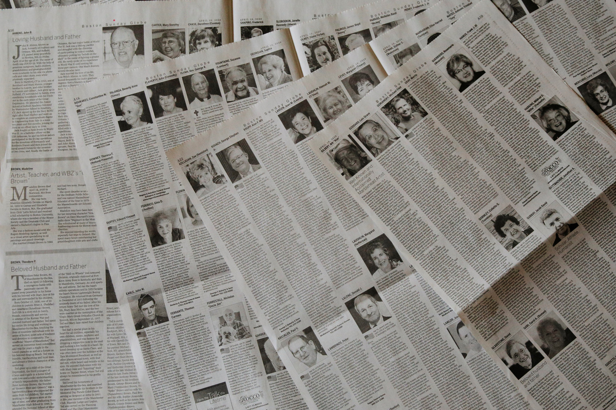 The April 19, 2020 Sunday Boston Globe has 16 pages dedicated to obituaries, as shown in this photo-illustration, amid the coronavirus disease (COVID-19) outbreak in Medford, Massachusetts, U.S., April 20, 2020. REUTERS/Brian Snyder