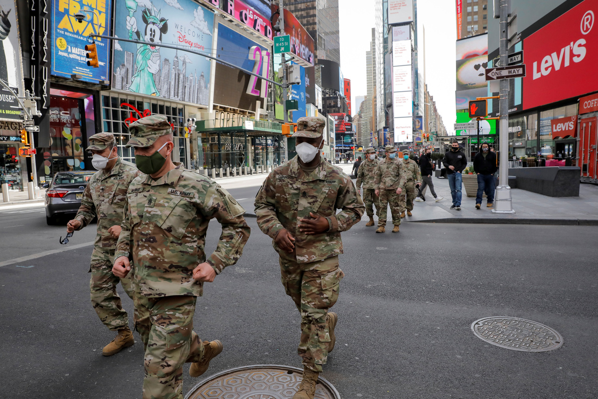 New York State Army National Guard soldiers walk through Times Square, during the outbreak of the coronavirus disease (COVID-19) in New York City, New York, U.S., April 20, 2020. REUTERS/Andrew Kelly