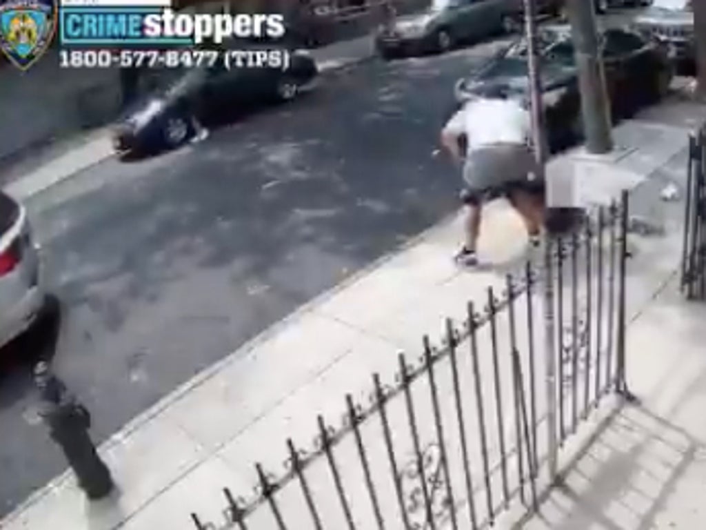Surveillance footage from a Brooklyn street on 12 July shows a bearded man in shorts and a white T-shirt pulling the passerby – a 25-year-old man who has not been named – down to the ground and snatching his belongings. The passerby in blue jeans is seen trying to fight him off.