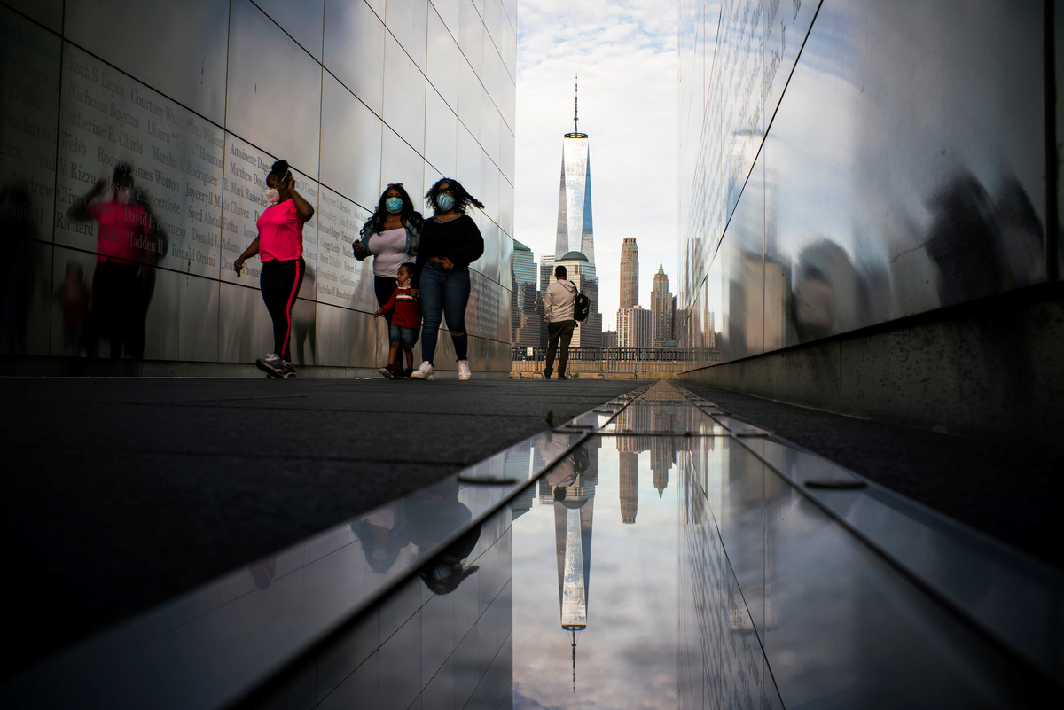 People visit the Empty Sky Memorial as the The One World Trade Center in New York is seen from Liberty State Park after many New Jersey Parks set to re-open during the outbreak of the coronavirus disease (COVID-19) in Jersey City, New Jersey, U.S., May 2, 2020. REUTERS/Eduardo Munoz