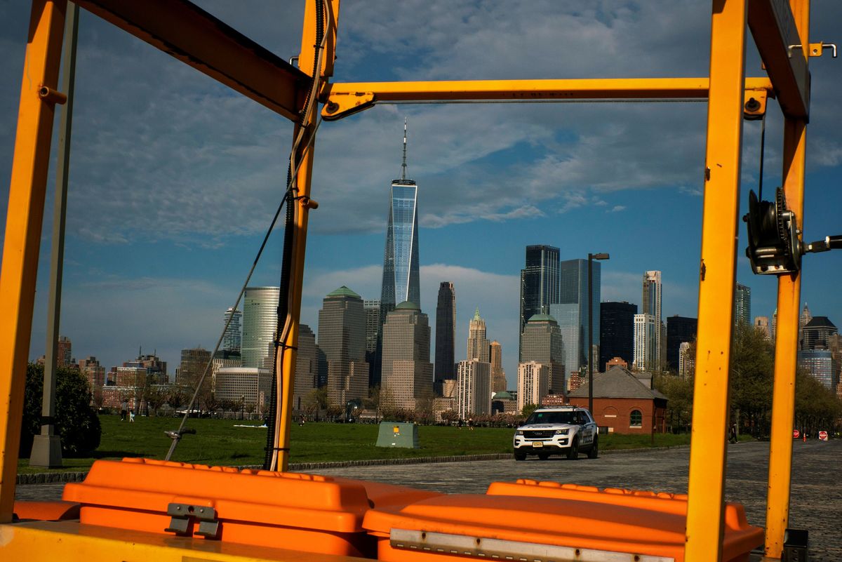 A New Jersey Police car patrols the Liberty State Park as the The One World Trade Center in New York is seen at the background after many New Jersey Parks set to re-open during the outbreak of the coronavirus disease (COVID-19) in Jersey City, New Jersey, U.S., May 2, 2020. REUTERS/Eduardo Munoz