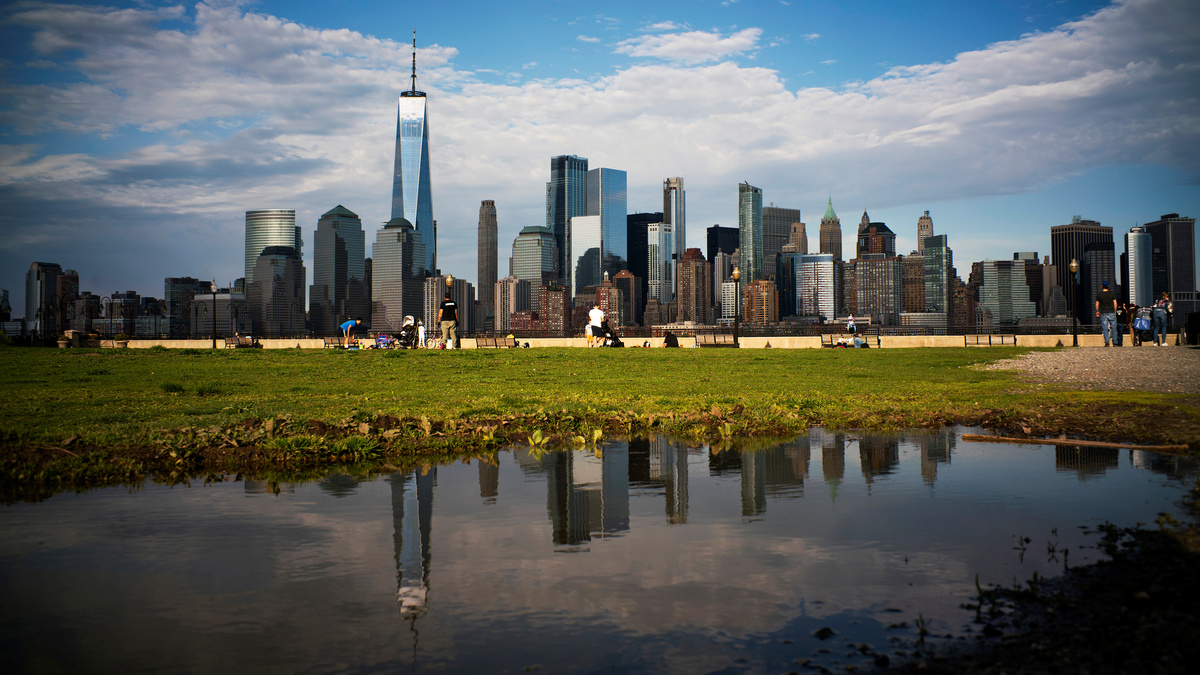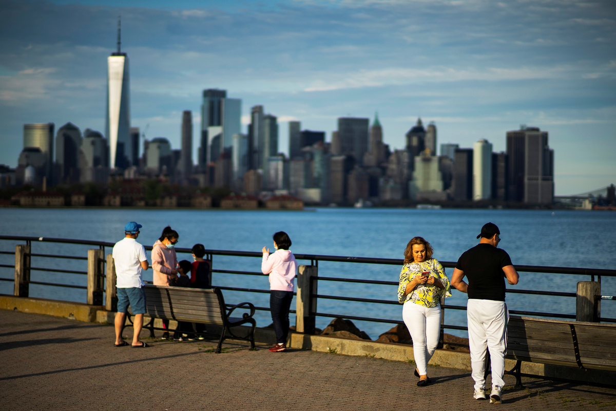People visit the Liberty State Park as the One World Trade Center in New York is seen after many New Jersey Parks set to re-open during the outbreak of the coronavirus disease (COVID-19) in Jersey City, New Jersey, U.S., May 2, 2020. REUTERS/Eduardo Munoz