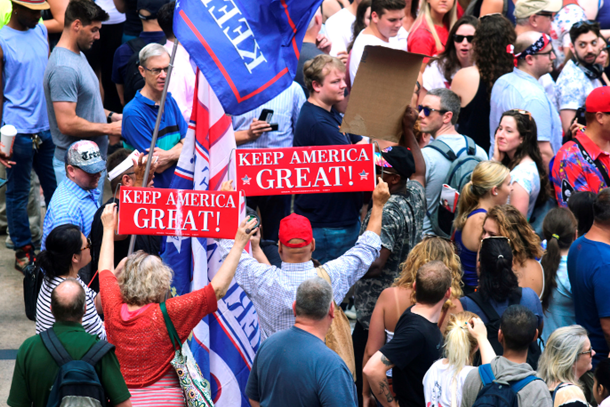 As she spoke, a few spectators waved "Trump 2020" flags and one held a sign calling Rapinoe an "America hater," an apparent reference to her refusal to put a hand over her heart when the U.S. national anthem was played during the World Cup.
