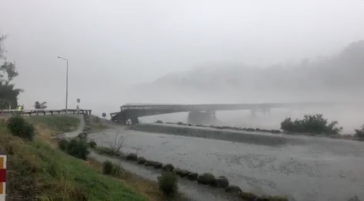 Footage shown on local television and distributed on social media showed part of the Waiho Bridge, near the town of Franz Josef, breaking off in torrential river flooding and swaying loose in the rushing water, with the remaining sections soon collapsing.