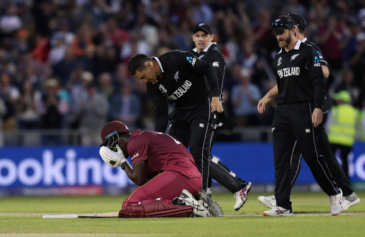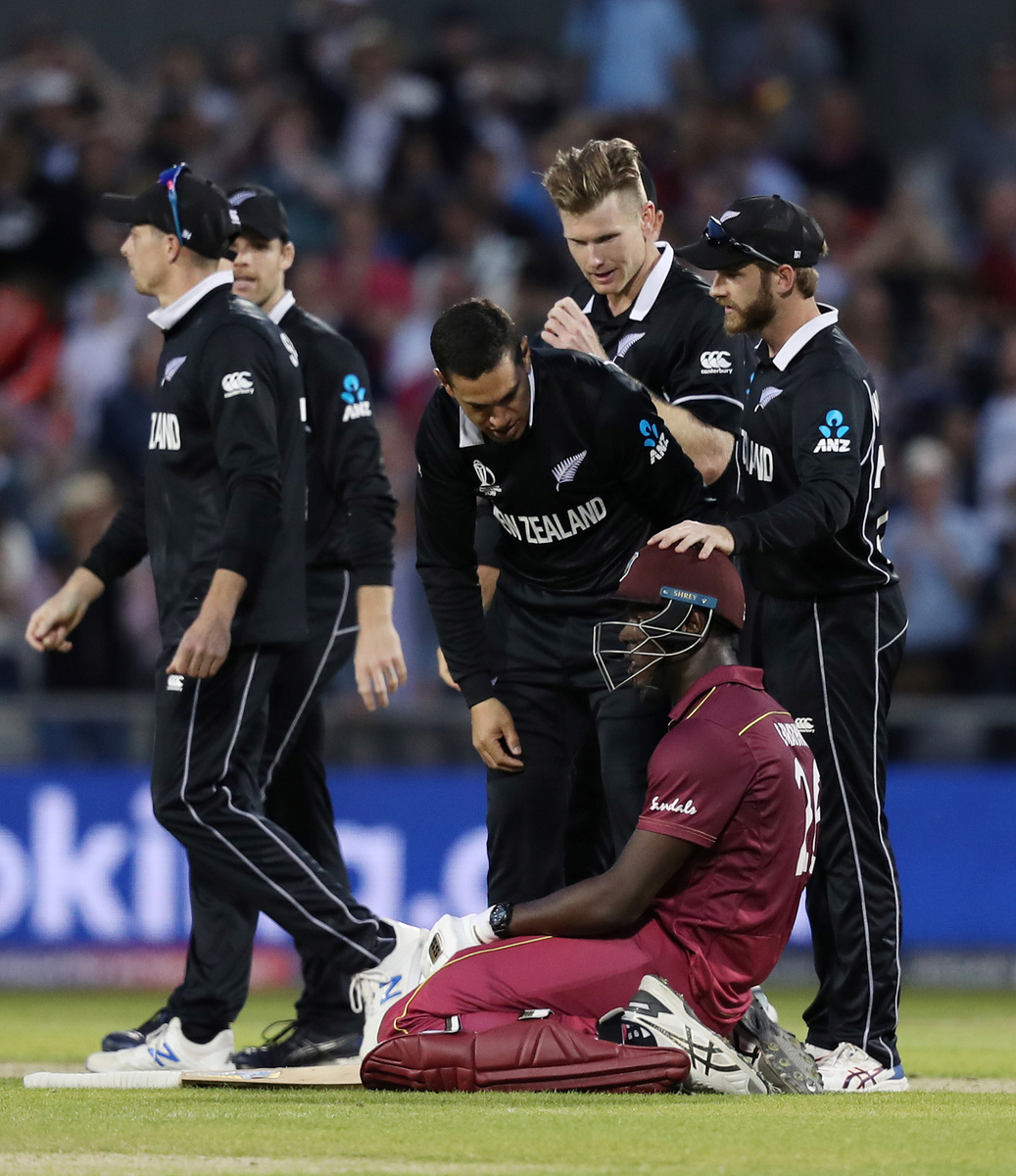 MANCHESTER, England (Reuters) - New Zealand moved to the brink of the World Cup semi-finals with a thrilling five-run victory over West Indies on Saturday after Carlos Brathwaite's magnificent century almost produced a highly unlikely comeback win for the Caribbean side.