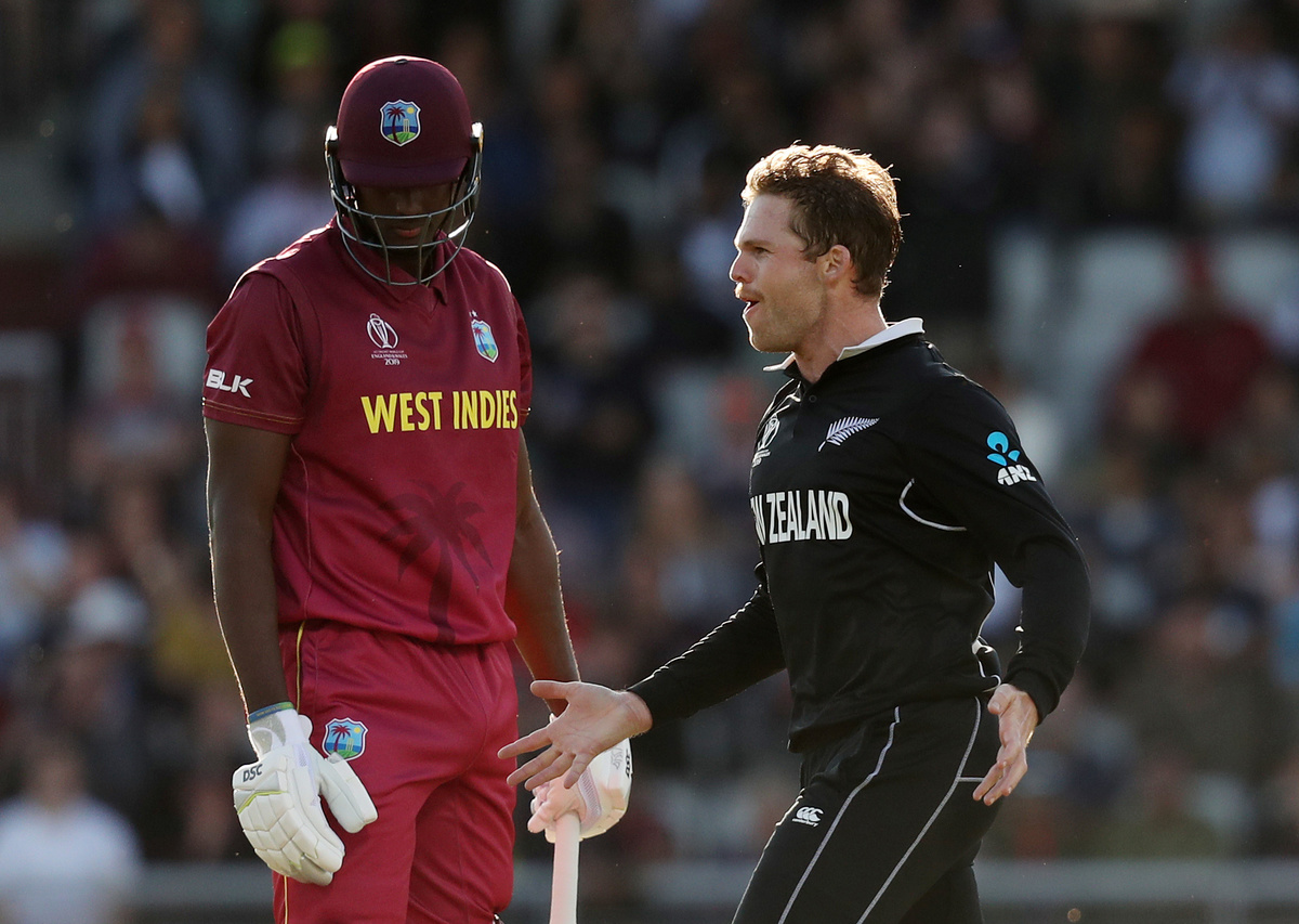 Cricket - ICC Cricket World Cup - West Indies v New Zealand - Old Trafford, Manchester, Britain - June 22, 2019 New Zealand's Colin de Grandhomme celebrates taking the wicket of West Indies' Chris Gayle Action Images via Reuters/Lee SmithCricket - ICC Cricket World Cup - West Indies v New Zealand - Old Trafford, Manchester, Britain - June 22, 2019 West Indies' Carlos Brathwaite and Oshane Thomas look dejected after losing the match Action Images via Reuters/Lee SmithCricket - ICC Cricket World Cup - West Indies v New Zealand - Old Trafford, Manchester, Britain - June 22, 2019 New Zealand's Lockie Ferguson celbrates taking the wicket of West Indies' Jason Holder Action Images via Reuters/Lee Smith