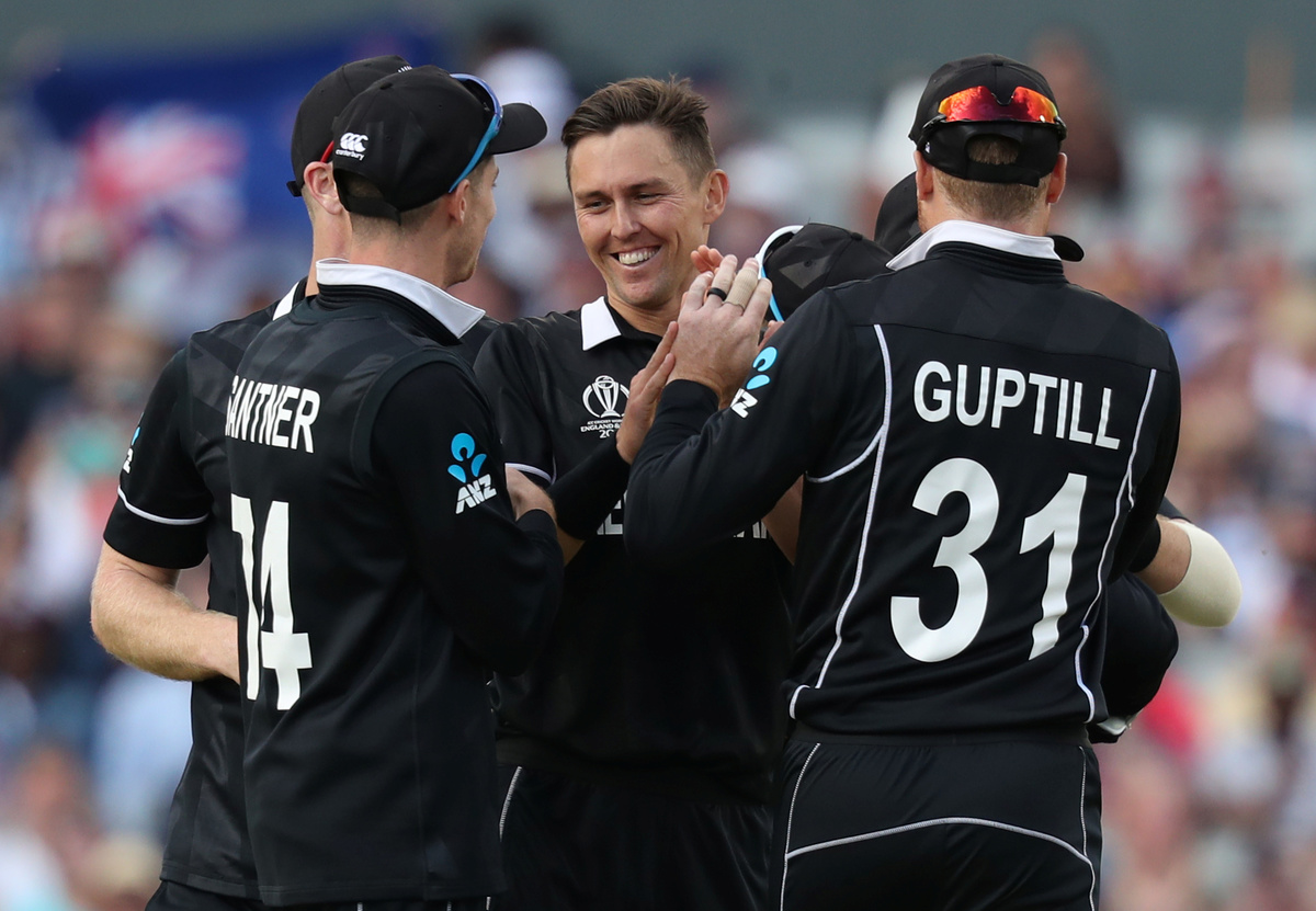 Cricket - ICC Cricket World Cup - West Indies v New Zealand - Old Trafford, Manchester, Britain - June 22, 2019 New Zealand's Trent Boult celebrates taking the wicket of West Indies' Nicholas Pooran with team mates Action Images via Reuters/Lee Smith