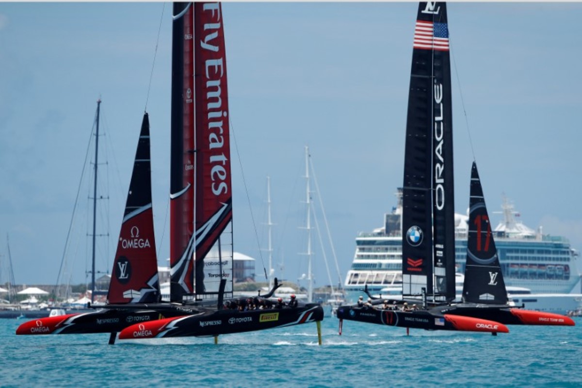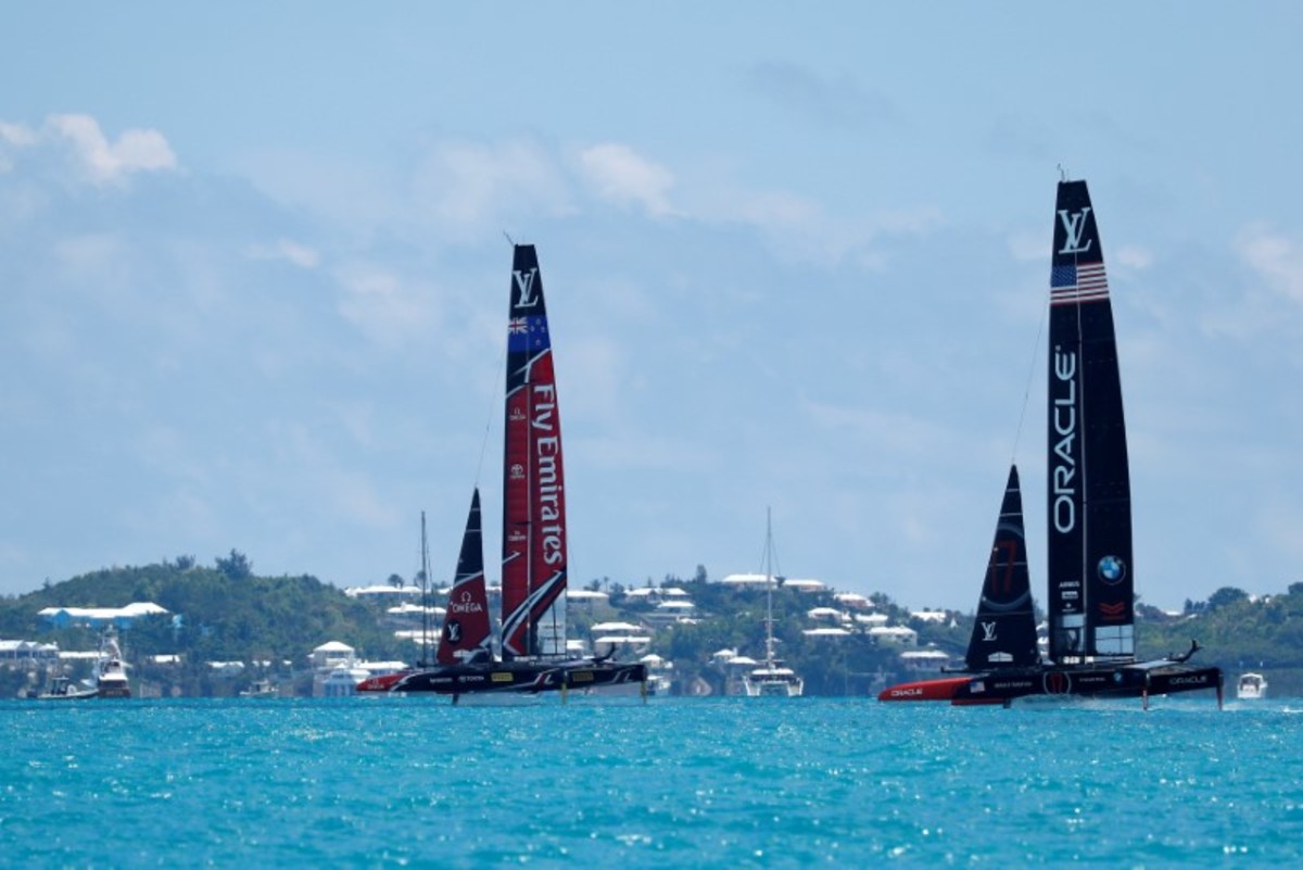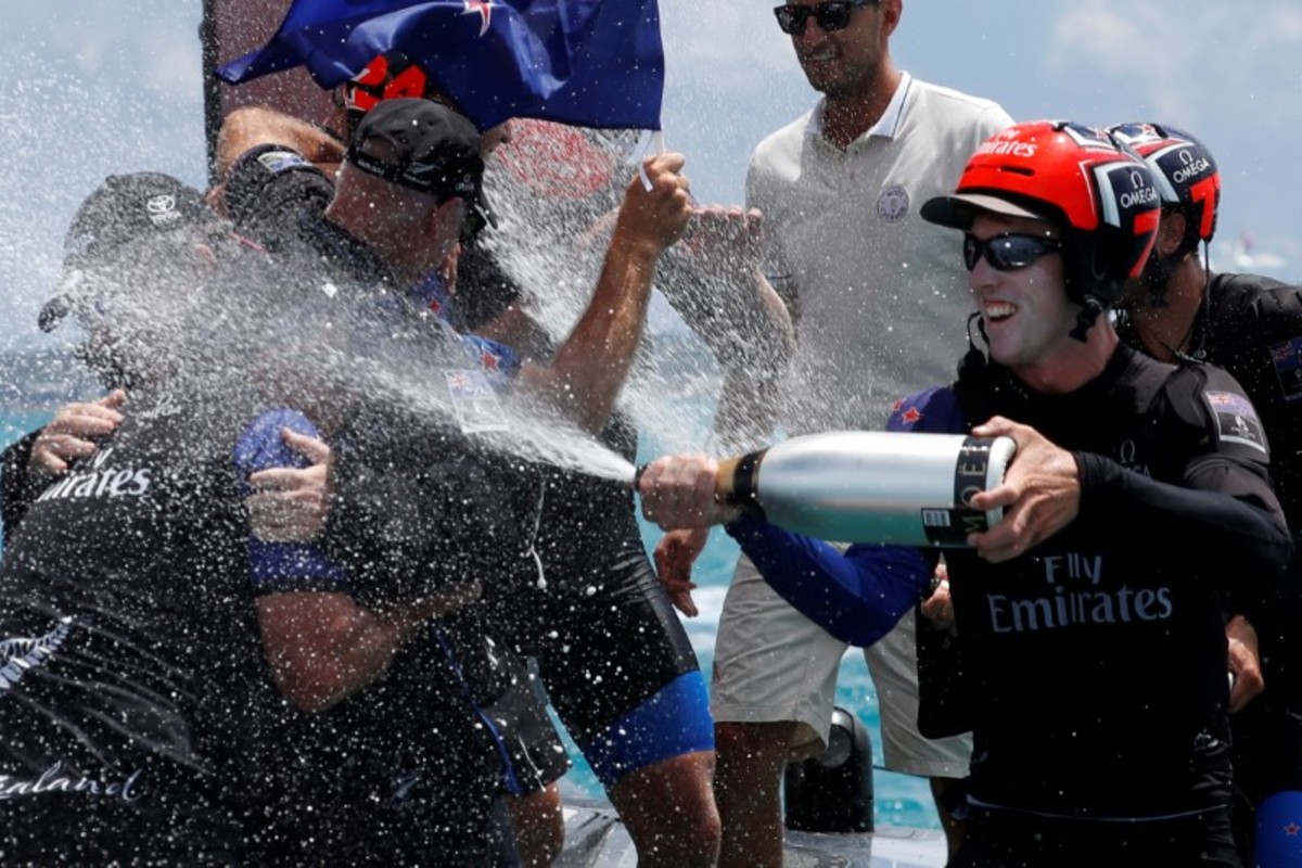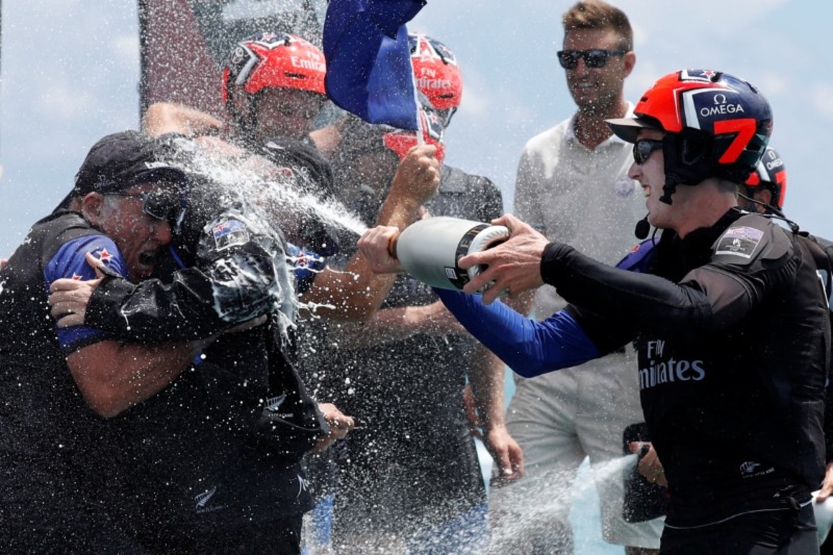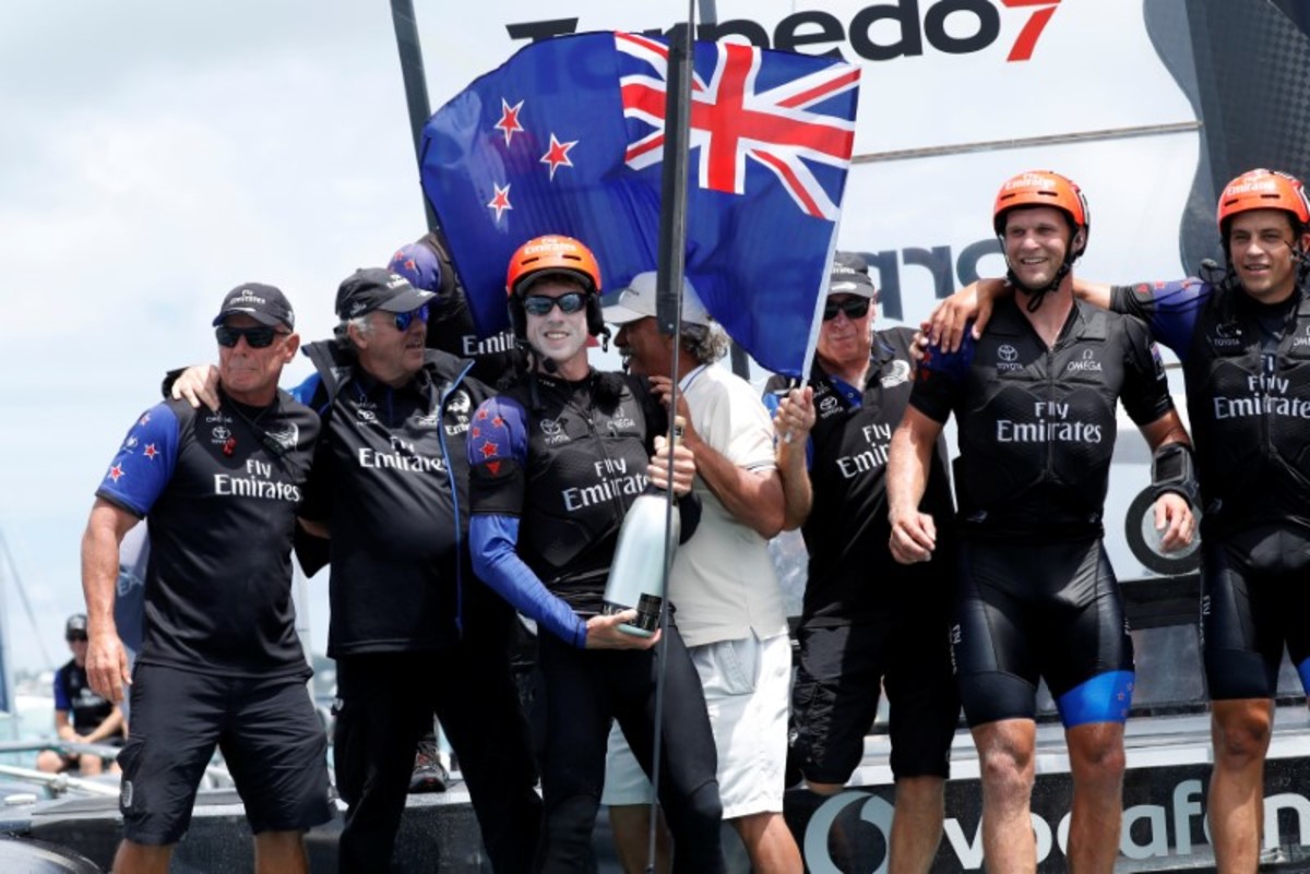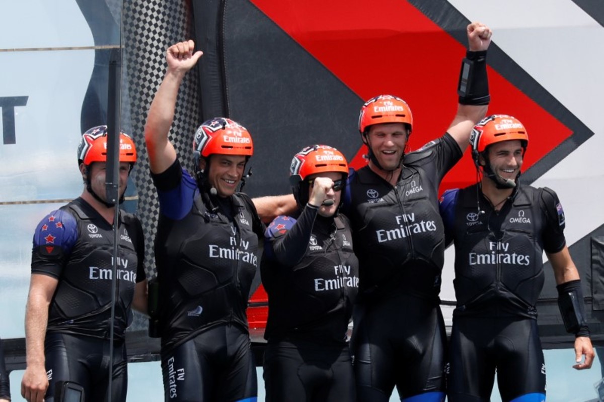 New Zealand won the right to take on the U.S. by beating four other "challengers" from Britain, France, Japan and Sweden, using cycling sailors dubbed "cyclors" to provide pedal power to control their catamaran's vast "wing" sail and hydrofoils.