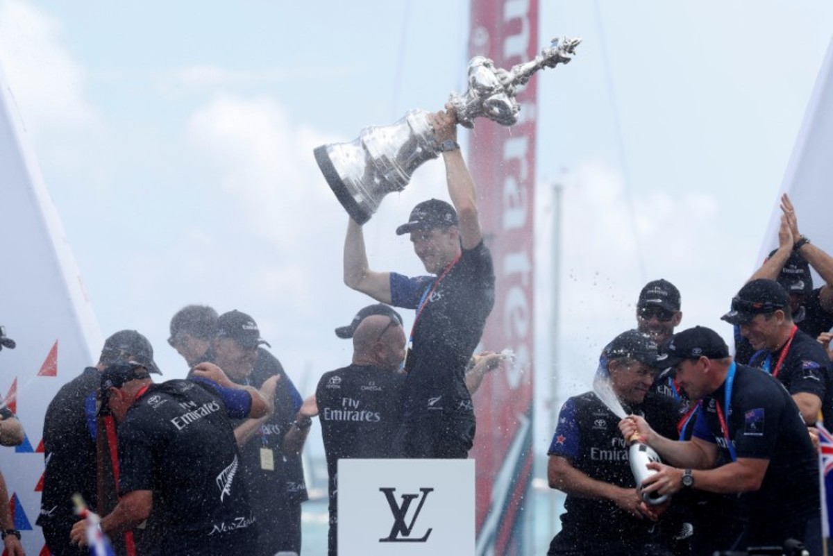 New Zealanders, in their uniform of black shirts and red socks, feted the victors with flags and cheers as Burling, Ashby and the team lifted the ornate silver trophy, which they later paraded triumphantly back to their base.