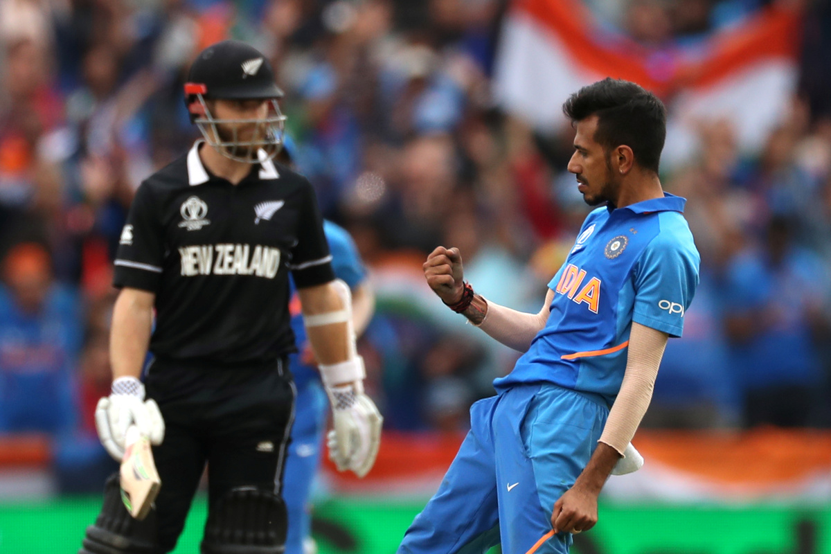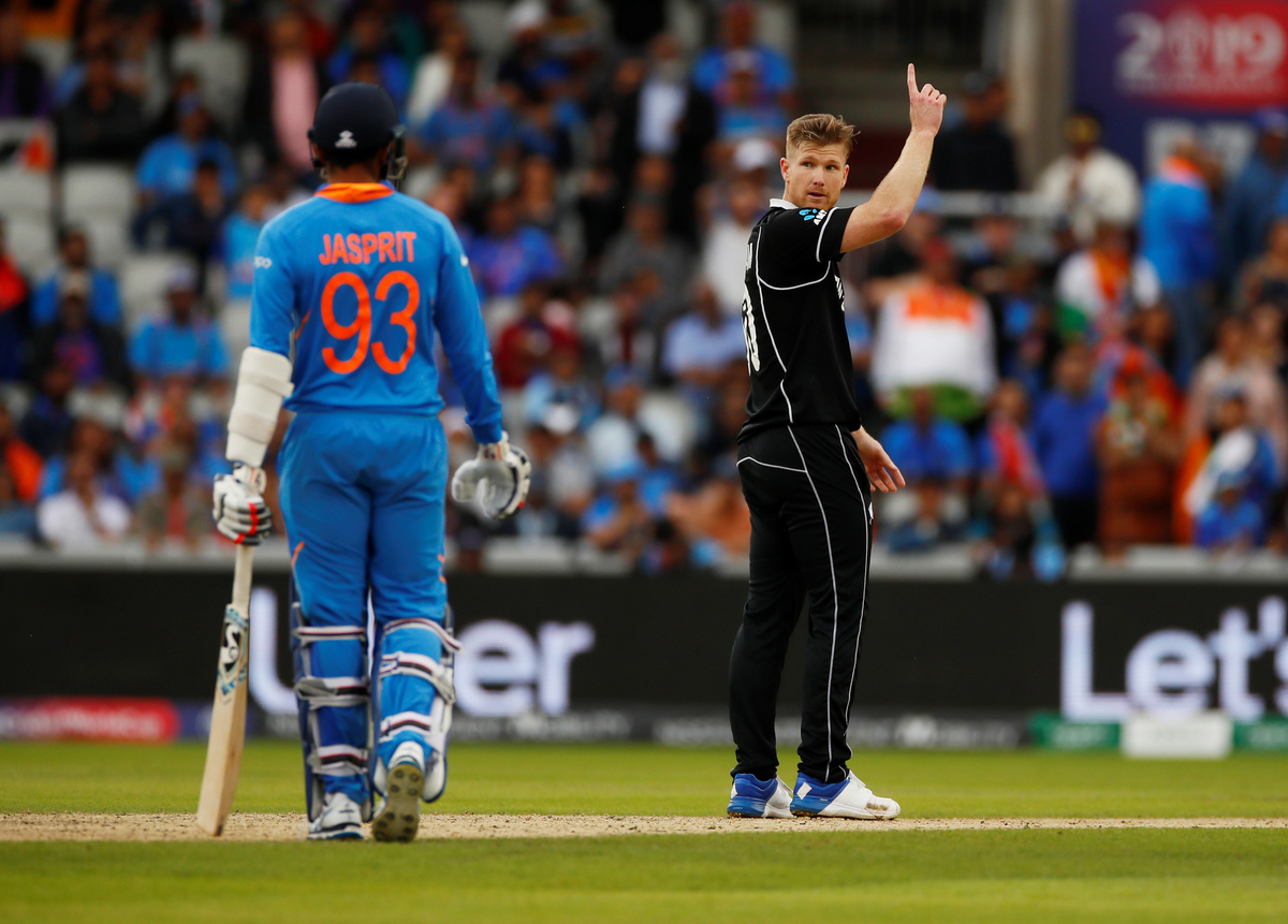 Cricket - ICC Cricket World Cup Semi Final - India v New Zealand - Old Trafford, Manchester, Britain - July 10, 2019 New Zealand's James Neesham celebrates the wicket of India's Yuzvendra Chahal Action Images via Reuters/Jason Cairnduff
