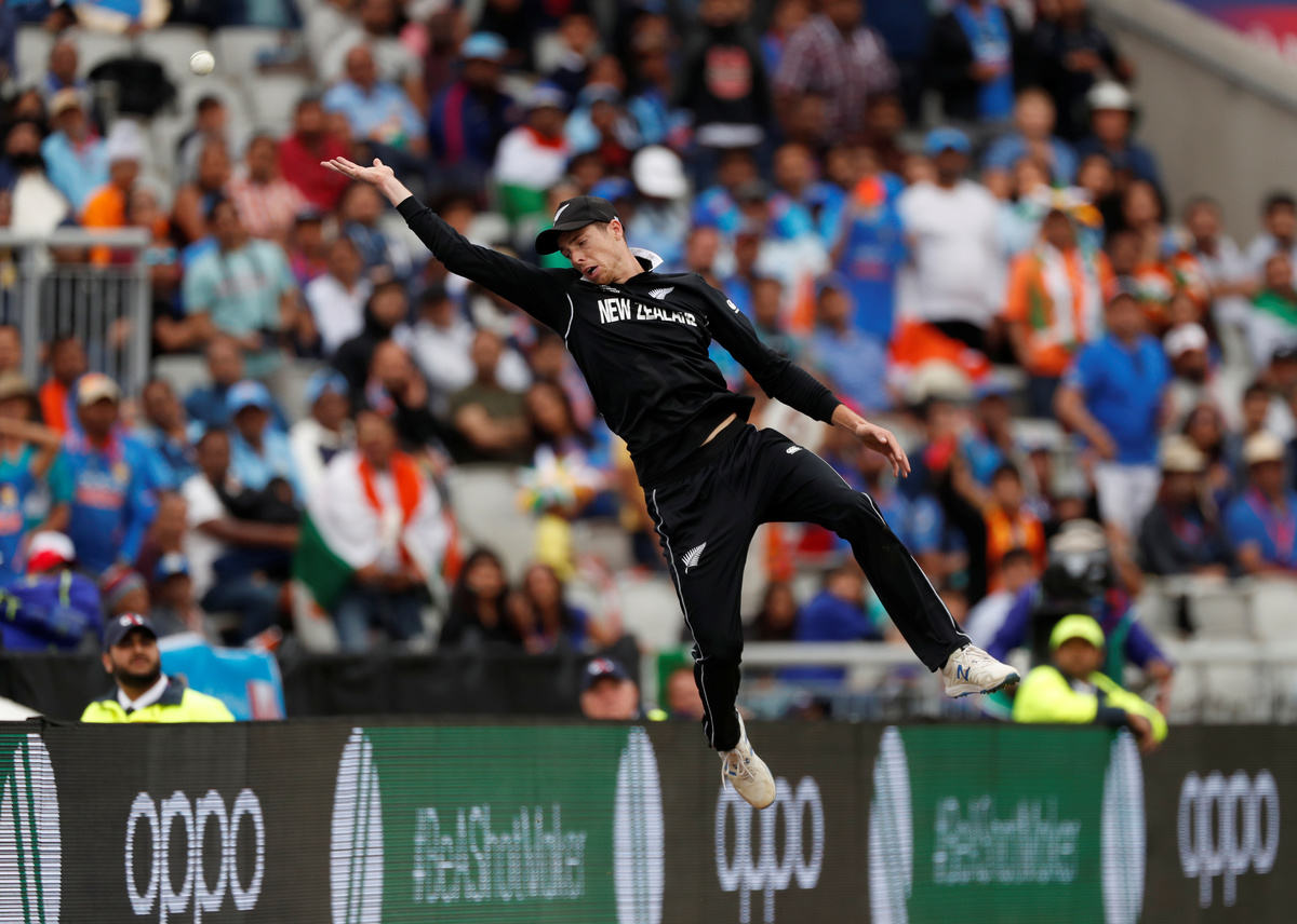Jimmy Neesham took a magnificent left-handed catch to dismiss Dinesh Karthik as India slumped to 24-4 in 10 overs.