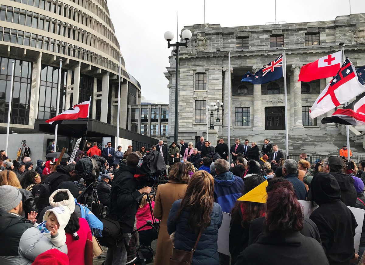 Hundreds of protesters gathered in front of parliament on Tuesday shouting slogans and carrying placards that said: "Hands off our tamariki" - the Maori word for children. Protests were also held in other major cities.