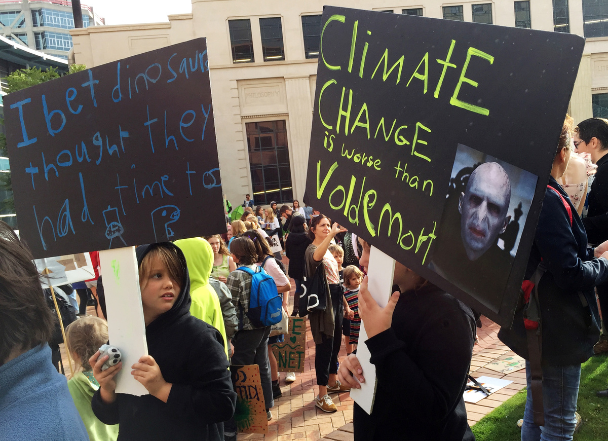 "Climate change is worse than Voldemort," read a handmade sign carried by one student in Wellington, referring to the evil wizard in the hugely popular Harry Potter books and films.