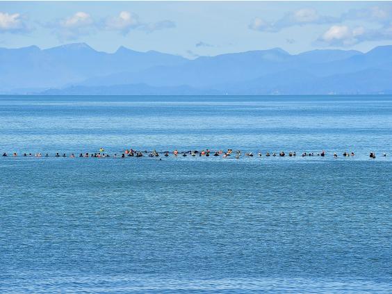 More than 100 volunteers waded into neck-deep water to form a barrier, braving predators and the elements, in the hope of encouraging what is left of the group to swim into deeper water.