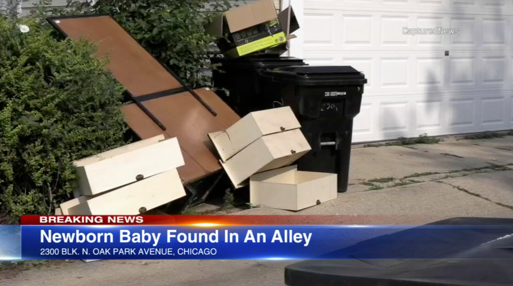 A newborn baby was discovered languishing in a discarded set of drawers in 90-degree heat in an alley in Chicago, narrowly avoiding being picked up by garbage trucks later that morning.