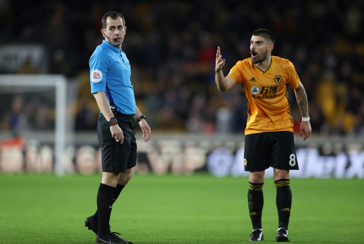 Soccer Football - Premier League - Wolverhampton Wanderers v Newcastle United - Molineux Stadium, Wolverhampton, Britain - January 11, 2020 Wolverhampton Wanderers' Ruben Neves remonstrates with referee Peter Bankes Action Images via Reuters/Carl Recine