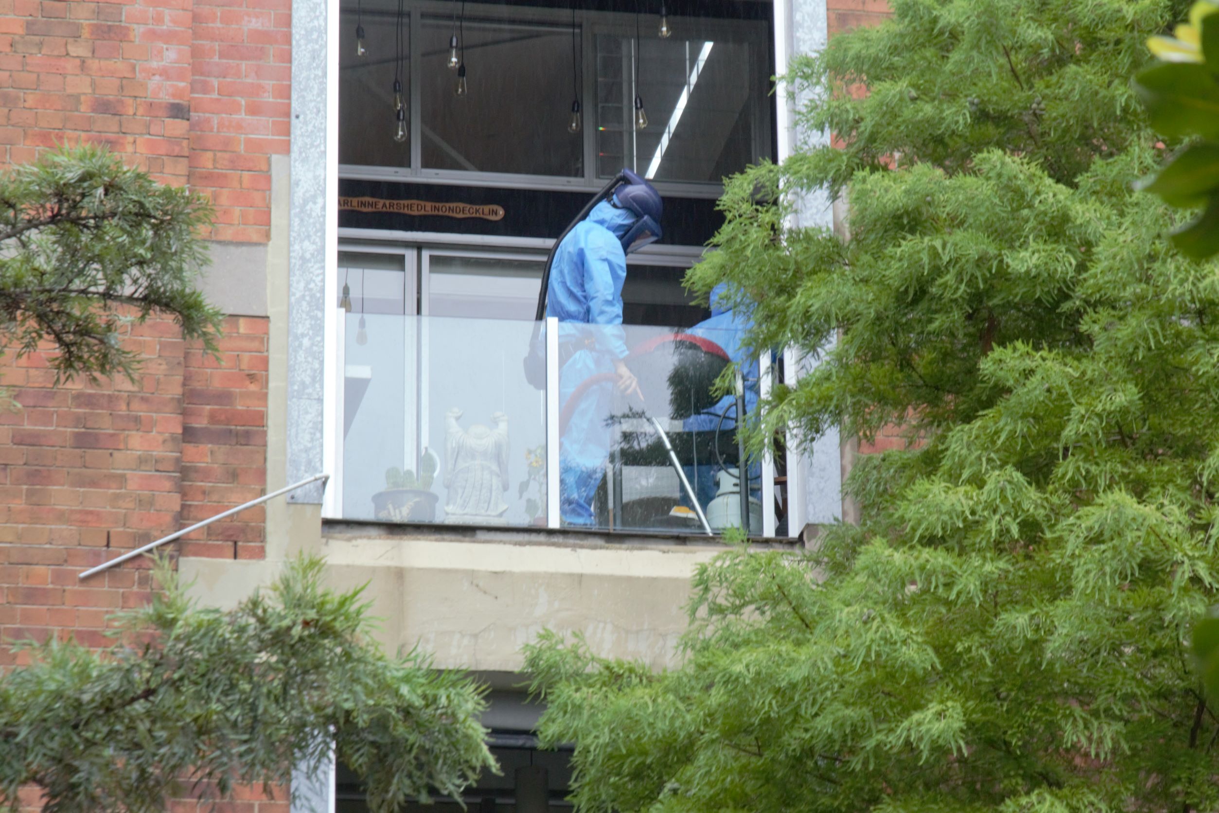Yet, directly across the road, asbestos contractors in hazmat suits were cleaning the evacuated apartments.