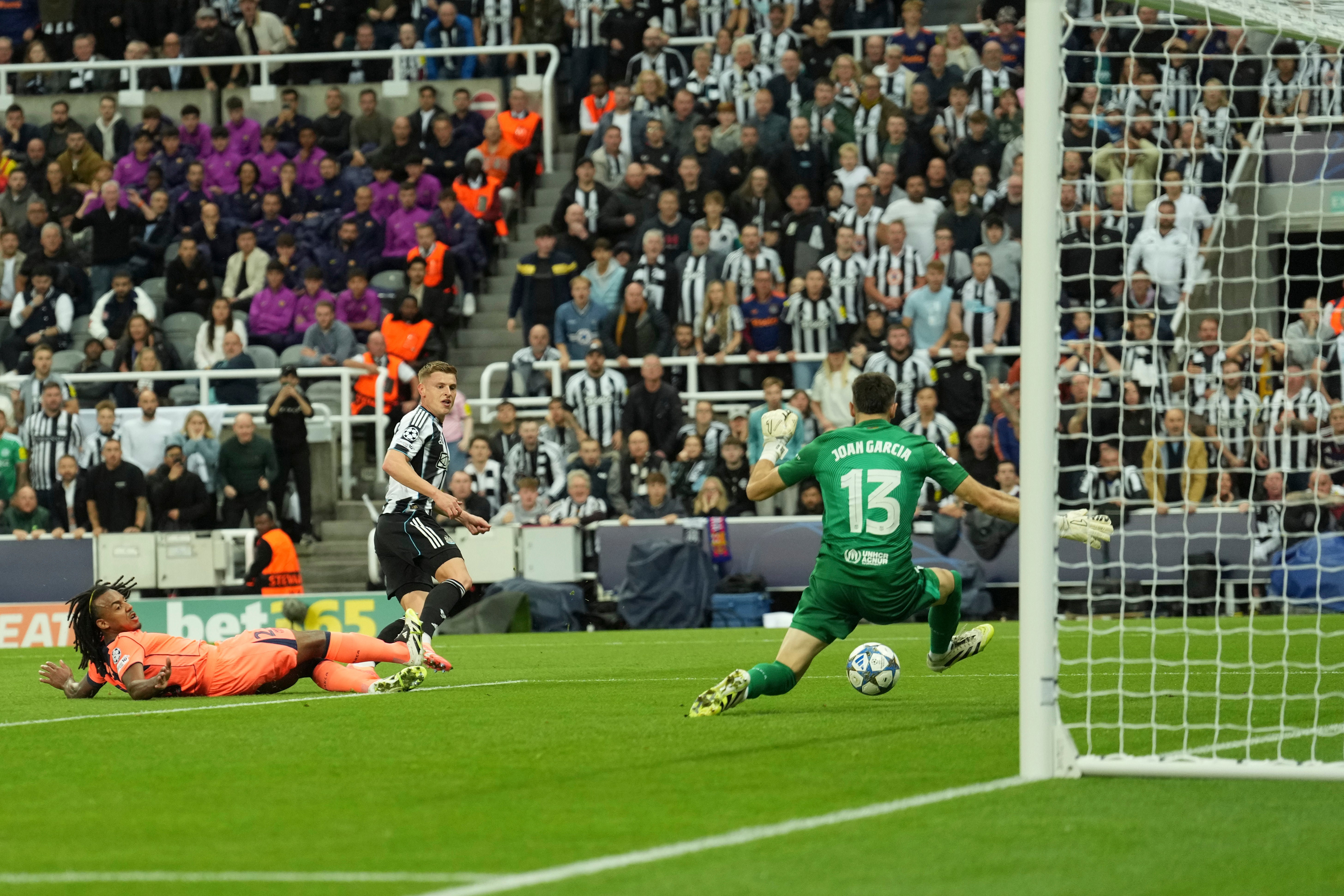 Newcastle had been competitive against the Spanish champions until that point, and had the best chance of the first half as Anthony Elanga set up Harvey Barnes at the back post, only for Joan Garcia to save.