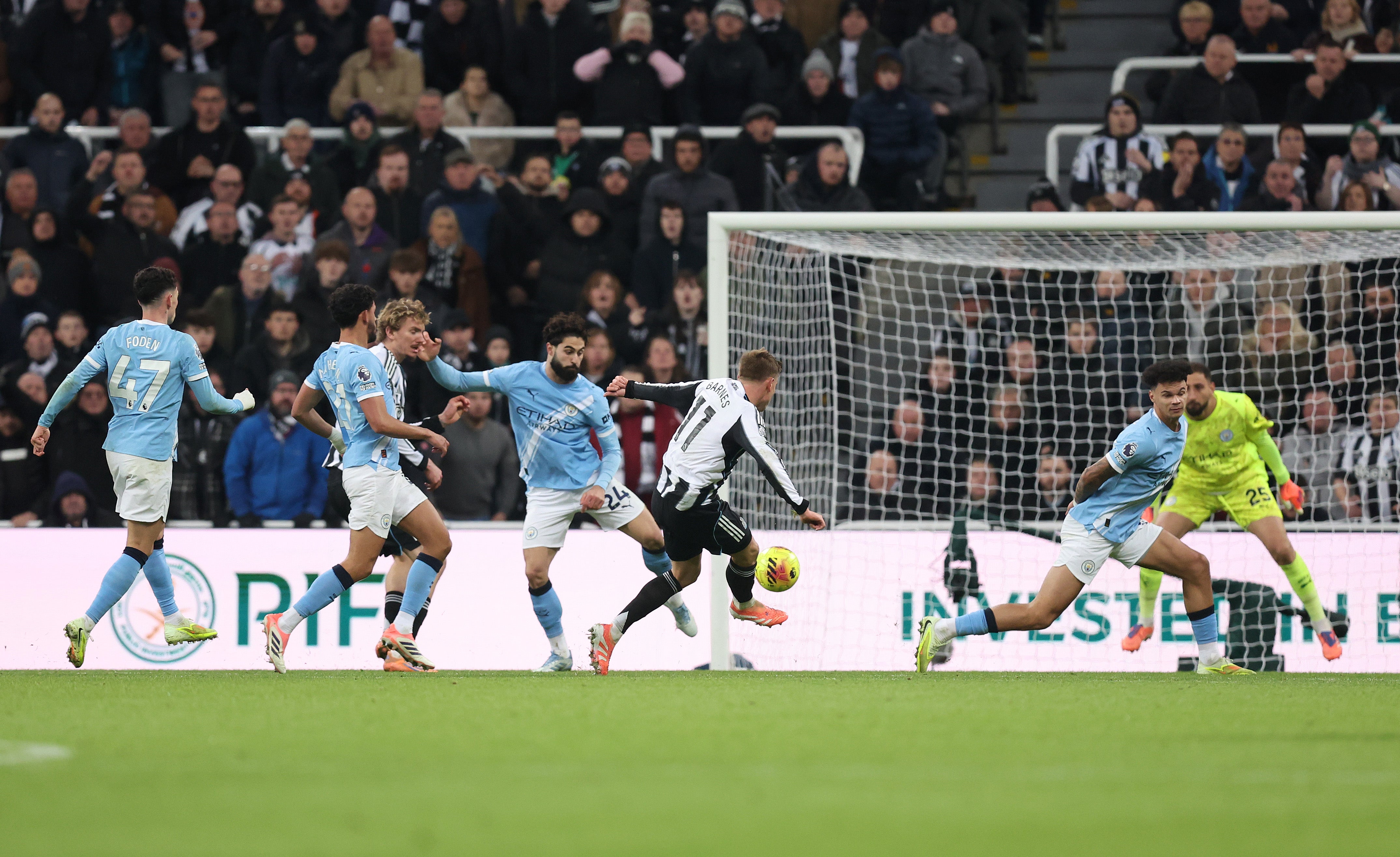City keep coming but Newcastle are holding firm for now, though they win a corner as Joelinton stops the run of Bobb in the box.