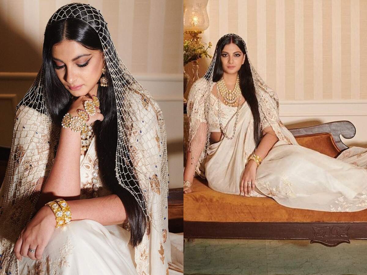 The ace fashion enthusiast opted for a vintage-inspired look in an ivory chanderi saree with gold detailings from Anamika Khanna, paired with her mother Sunita Kapoor’s jewellery, including a rani haar, a kundan choker, polka earrings, khadas and a haanthphool. Her pearl-embellished veil added an extra oomph to the entire look.