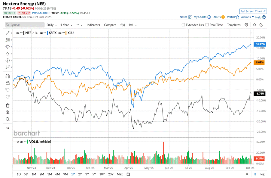 NextEra Energy has declined 8.5% over the past 52 weeks, underperforming both the S&P 500 Index's ($SPX) 17.6% return and the Utilities Select Sector SPDR Fund’s (XLU) 7.9% uptick over the same time frame.