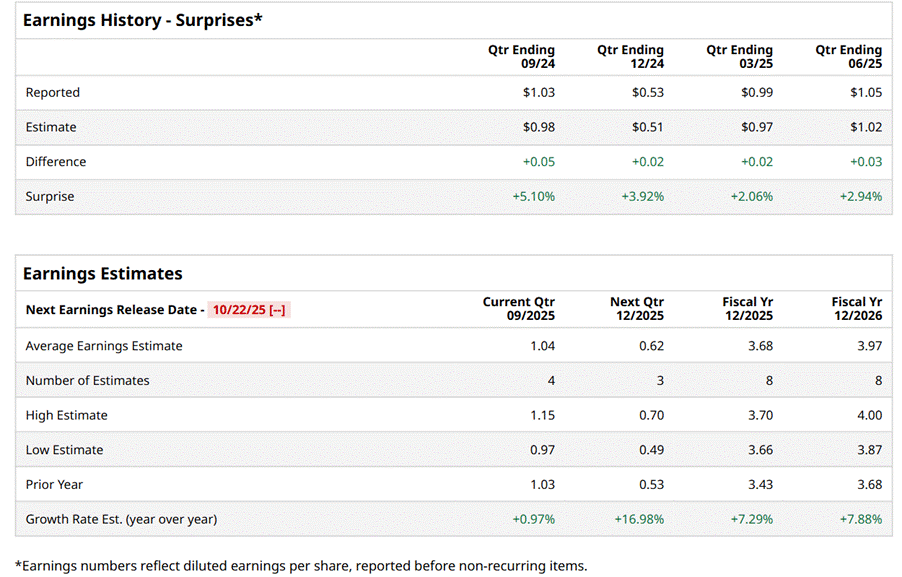 Juno Beach, Florida-based NextEra Energy, Inc. (NEE) generates, transmits, distributes, and sells electric power to retail and wholesale customers. Valued at a market cap of $162 billion, the company generates electricity through wind, solar, nuclear, natural gas, and other clean energy sources. It is expected to announce its fiscal Q3 earnings for 2025 on Wednesday, Oct. 22.