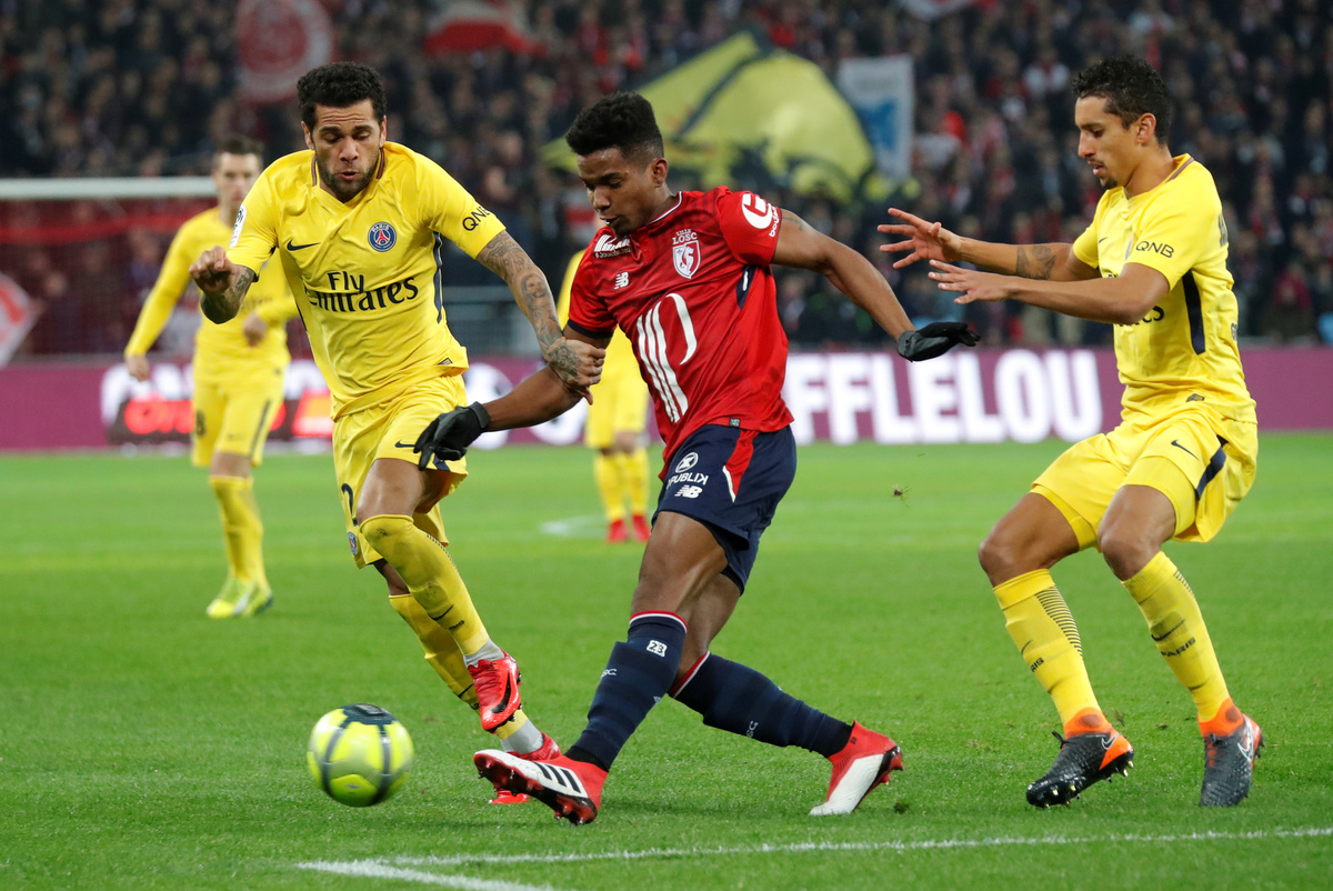 Soccer Football - Ligue 1 - LOSC Lille vs Paris St Germain - Stade Pierre-Mauroy, Lille, France - February 3, 2018 Lille’s Thiago Mendes in action with Paris Saint-Germain’s Dani Alves and Marquinhos REUTERS/Charles Platiau