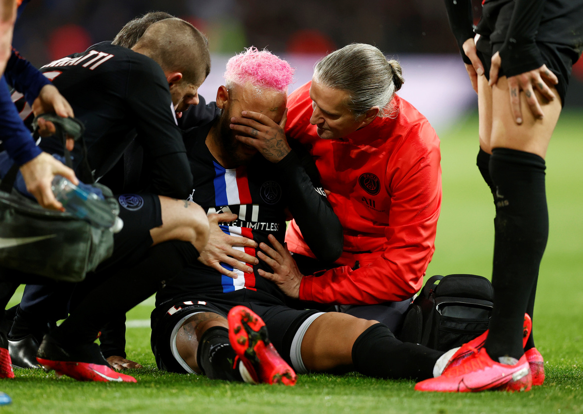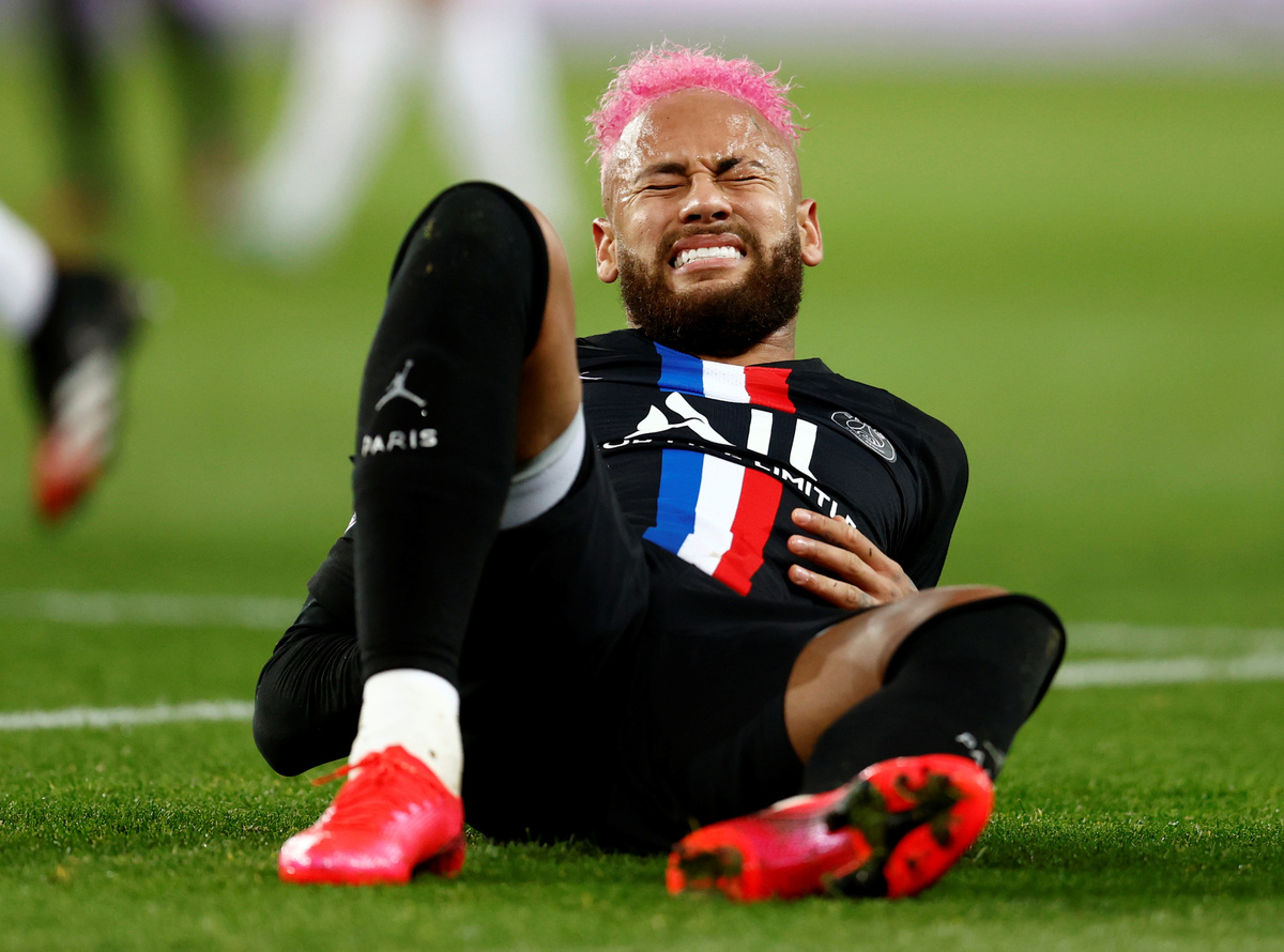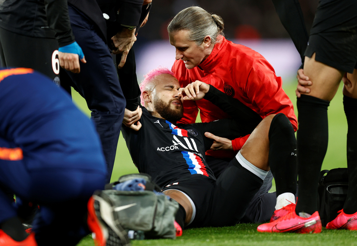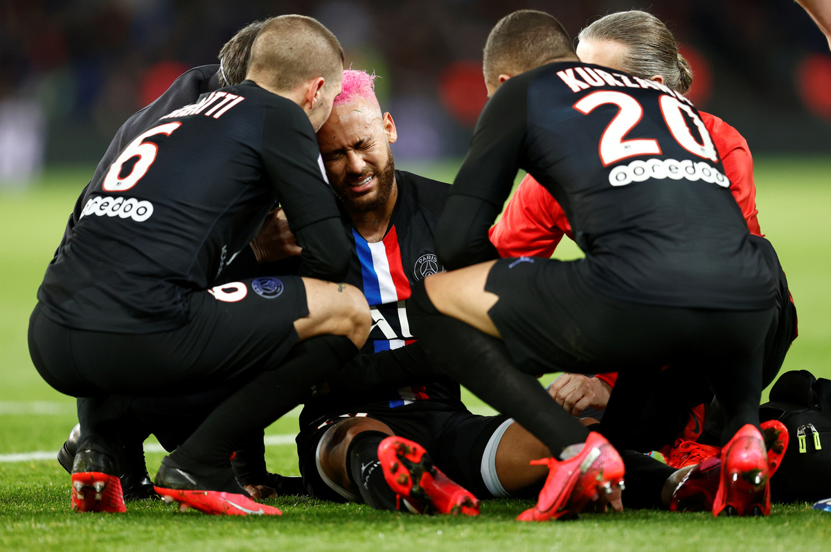 FILE PHOTO: Soccer Football - Ligue 1 - Paris St Germain v Montpellier - Parc des Princes, Paris, France - February 1, 2020 Paris St Germain's Neymar on the ground after sustaining an injury REUTERS/Gonzalo FuentesFILE PHOTO: Soccer Football - Ligue 1 - Paris St Germain v Montpellier - Parc des Princes, Paris, France - February 1, 2020 Paris St Germain's Neymar is treated by medical staff on the ground after sustaining an injury REUTERS/Gonzalo FuentesFILE PHOTO: Soccer Football - Ligue 1 - Paris St Germain v Montpellier - Parc des Princes, Paris, France - February 1, 2020 Paris St Germain's Neymar in action REUTERS/Gonzalo Fuentes