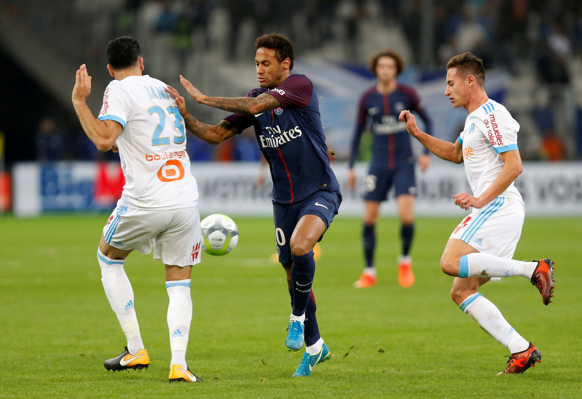 Soccer Football - Ligue 1 - Olympique de Marseille vs Paris St Germain - Orange Velodrome, Marseille, France - October 22, 2017 Paris Saint-Germain’s Neymar in action with Marseille's Adil Rami REUTERS/Philippe Laurenson