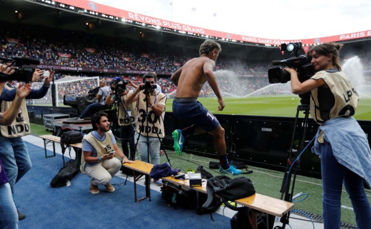Neymar, who was joined by PSG's CEO Nasser Al-Khelaifi, then paraded around the pitch, showing his ball-juggling skills and ending up bare-chested after throwing his shirt into the crowd.