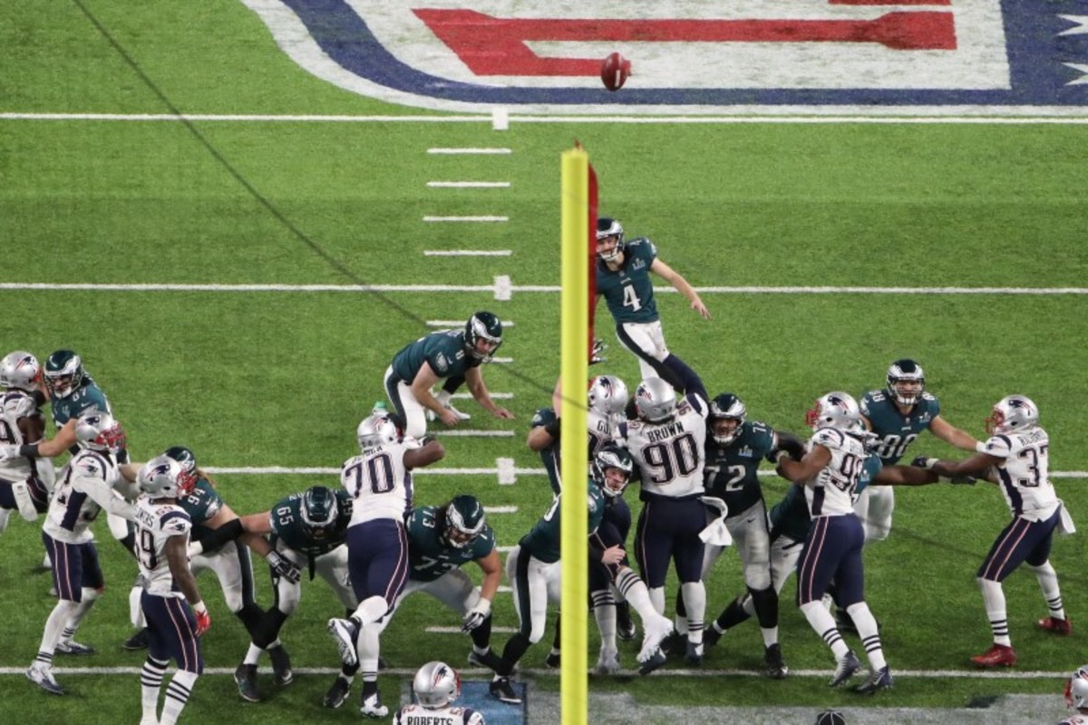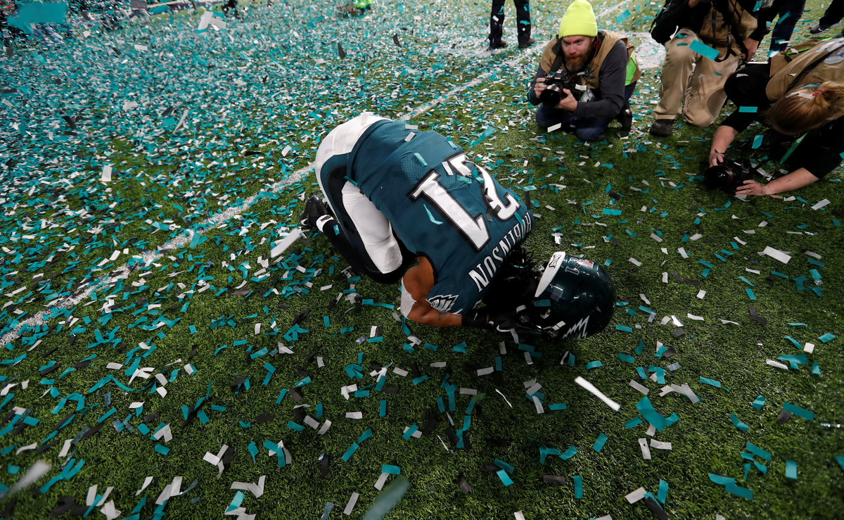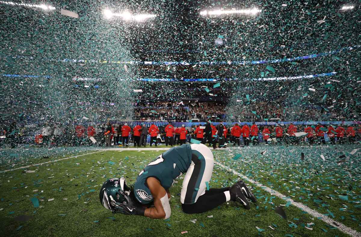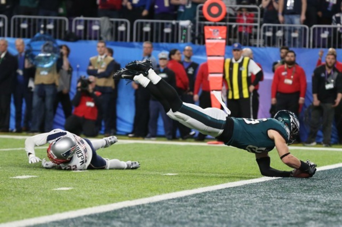 The Eagles went on to kick a field goal to extend their lead to eight points and prevented the Patriots from engineering a last-minute, game-tying drive.