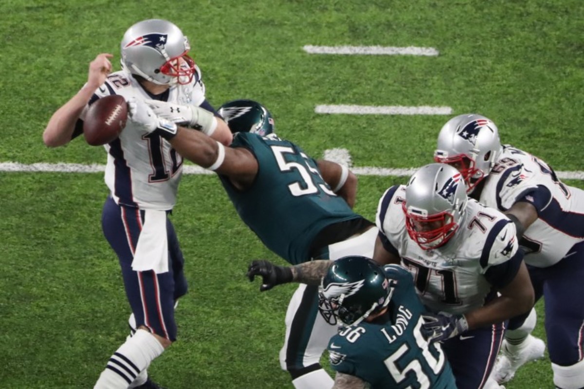 But in a game when both offenses moved up and down the field effortlessly and combined for a Super Bowl record 1,151 yards, Brady had the ball swatted from his grasp and it was recovered by Philadelphia to all but seal New England's fate.