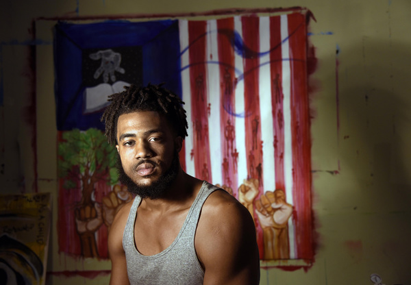 His paintings include one of eight clenched fists thrust in the air at the intersection of North and Pennsylvania avenues, where angry residents burned a CVS Pharmacy.