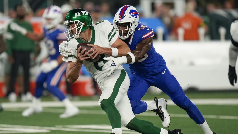 There’s really been as brutal of an instance on both fronts as the Jets planning everything around the arrival of four-time MVP quarterback Aaron Rodgers only to lose him — and essentially everything — four plays into their season opener. He tore the Achilles tendon in his left leg on a sack by former Bear Leonard Floyd, now with the Bills, on Monday and is out for the season.