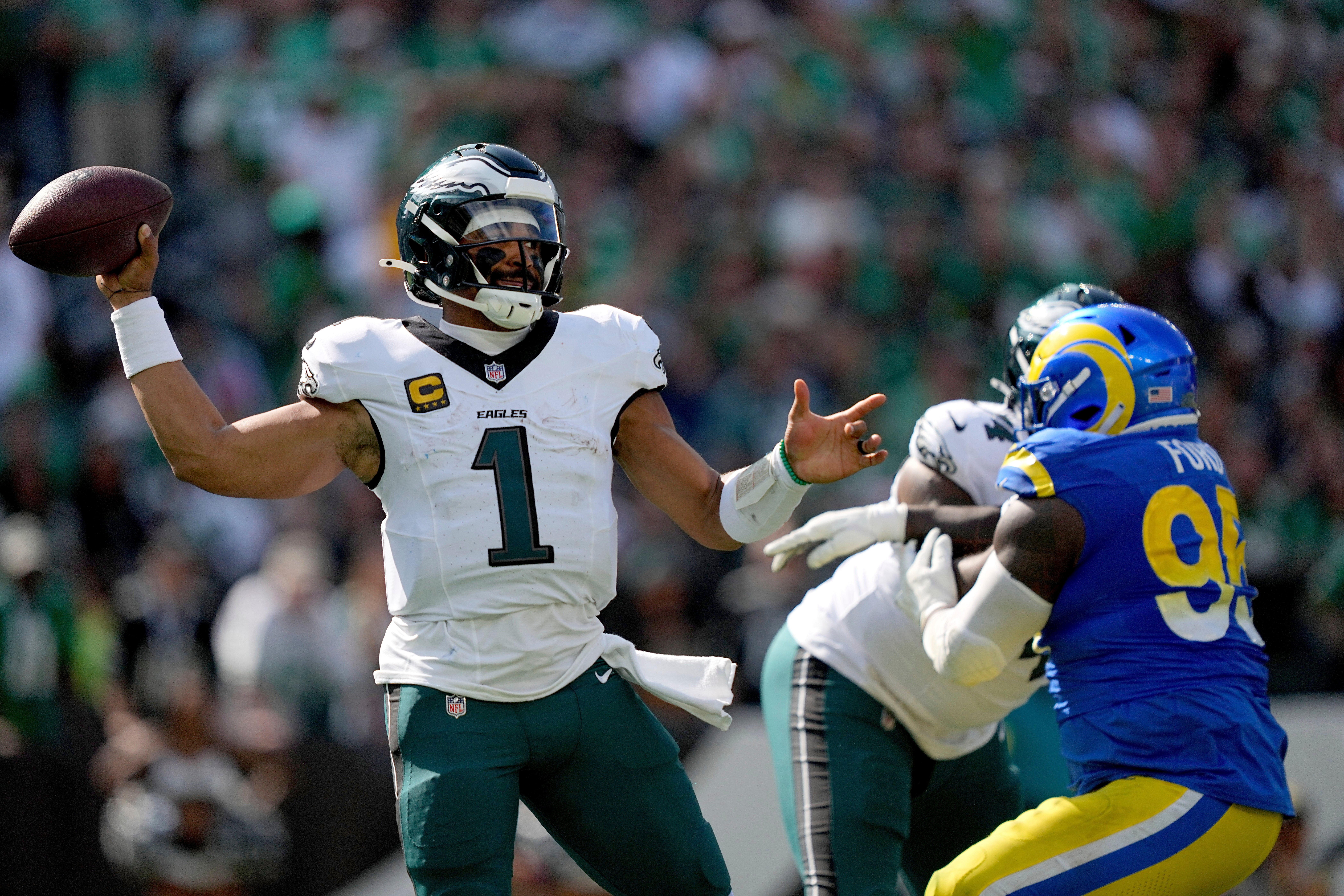 The Eagles looked set to suffer a first loss of the season but Joshua Karty’s potential game-winning field goal attempt for the Rams was blocked by Jordan Davis, who returned it for a touchdown.
