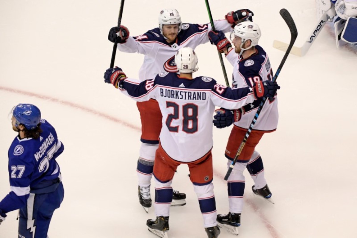 Oliver Bjorkstrand scored the go-ahead goal late in the first period to lift the Columbus Blue Jackets to a 3-1 victory over the Tampa Bay Lightning on Thursday in Game 2 of their Eastern Conference first-round series in Toronto.