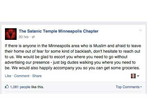 A local chapter of the US Satanic Temple was dubbed the "nicest Satanists ever" after it appeared to offer to discreetly escort local Muslims who feared violent reprisals in the wake of the Paris attacks.