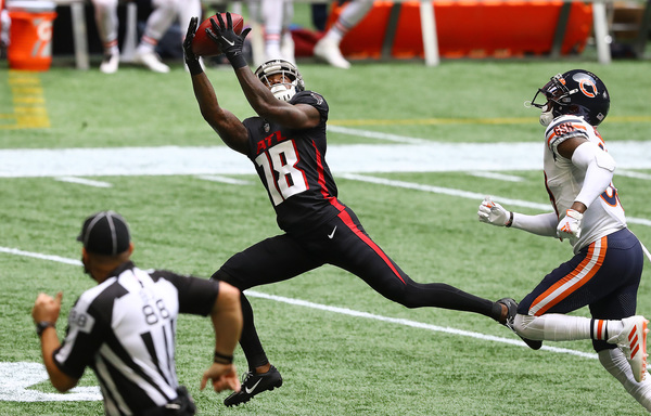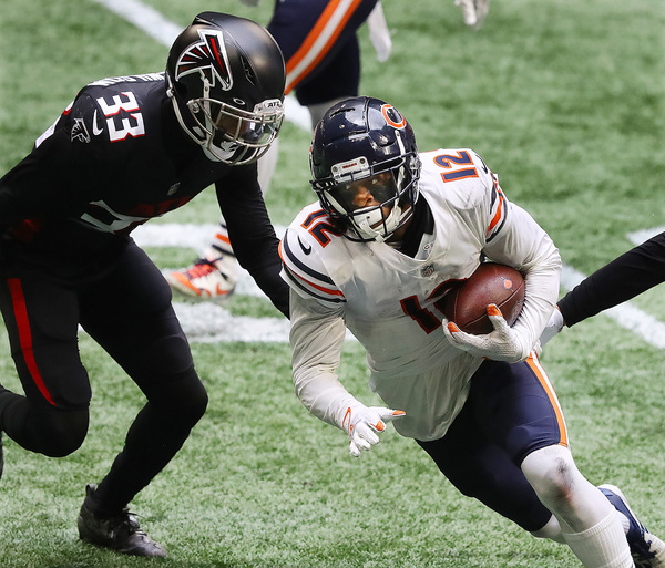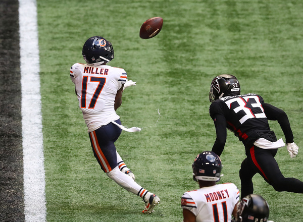 Chicago Bears wide receiver Allen Robinson II breaks away from Atlanta Falcons cornerbacks Blidi Wreh-Wilson for a touchdown to cut the Falcons lead to 26-23 during the fourth quarter in an NFL football game on Sunday, Sept. 27, 2020 in Atlanta, GA. The Bears scored 20 points in the fourth quarter to come from behind for a 30-26 victory over the Falcons. (Curtis Compton/Atlanta Journal-Constitution/TNS)