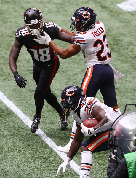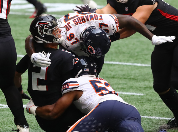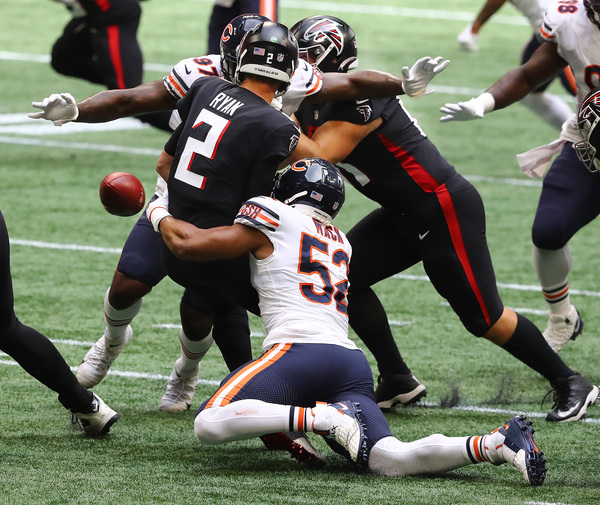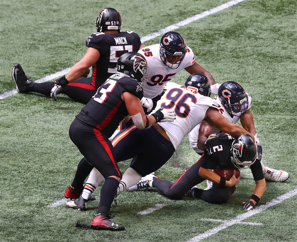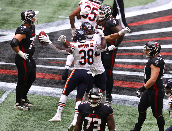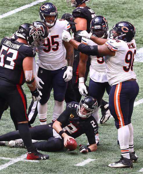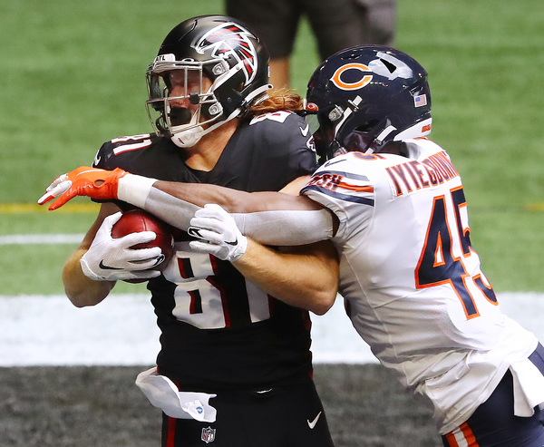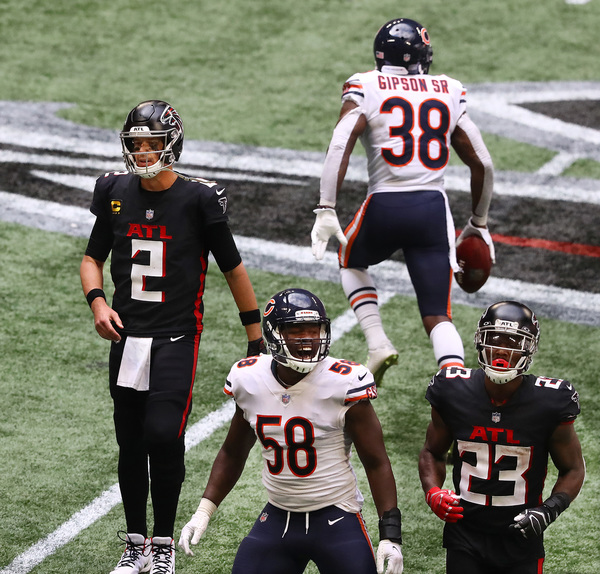 Atlanta Falcons tight end Hayden Hurst catches a touchdown pass past Chicago Bears linebacker Joel Iyiegbuniwe for a 6-0 lead in an NFL football game on Sunday, Sept. 27, 2020 in Atlanta, GA. The Falcons missed the extra point attempt. (Curtis Compton/Atlanta Journal-Constitution/TNS)Atlanta Falcons running back Todd Gurley, 21, and Damontae Kazee, 27, walk off the field after falling 30-26 to the Chicago Bears in an NFL football game on Sunday, Sept. 27, 2020 in Atlanta, GA. (Curtis Compton/Atlanta Journal-Constitution/TNS)Atlanta Falcons head coach Dan Quinn (right) walks off the field after falling 30-26 to the Chicago Bears in an NFL football game on Sunday, Sept. 27, 2020 in Atlanta, GA. (Curtis Compton/Atlanta Journal-Constitution/TNS)Atlanta Falcons quarterback Matt Ryan is sacked and stripped of the ball by Chicago Bears linebacker Khalil Mack and is leveled by Mario Edwards, who was called for unnecessary roughness, for what looked to be a turnover during the second quarter in an NFL football game on Sunday, Sept. 27, 2020 in Atlanta, GA. The Bears had 2 penaltys on the play negating the turnover. (Curtis Compton/Atlanta Journal-Constitution/TNS)Atlanta Falcons quarterback Matt Ryan is sacked and stripped of the ball by Chicago Bears linebacker Khalil Mack and is leveled by Mario Edwards, who was called for unnecessary roughness, for what looked to be a turnover during the second quarter in an NFL football game on Sunday, Sept. 27, 2020 in Atlanta, GA. The Bears had 2 penaltys on the play negating the turnover. (Curtis Compton/Atlanta Journal-Constitution/TNS)Atlanta Falcons wide receiver Calvin Ridley catches a bomb from Matt Ryan to setup a touchdown on the Falcons first drive and first offensive play of the game against the Chicago Bears during the first quarter in an NFL football game on Sunday, Sept. 27, 2020 in Atlanta, GA. (Curtis Compton/Atlanta Journal-Constitution/TNS)Atlanta Falcons wide receiver Calvin Ridley comes up just short of getting into the endzone while catching a bomb from Matt Ryan to setup a touchdown on the Falcons first drive and first offensive play of the game against the Chicago Bears during the first quarter in an NFL football game on Sunday, Sept. 27, 2020 in Atlanta, GA. (Curtis Compton/Atlanta Journal-Constitution/TNS)Atlanta Falcons quarterback Matt Ryan is sacked by Chicago Bears defenders Roy Robertson-Harris (from left), Akiem Hicks, and Khalil Mack during the fourth quarter in an NFL football game on Sunday, Sept. 27, 2020 in Atlanta, GA. The Bears scored 20 points in the fourth quarter for a 30-26 come from behind victory. (Curtis Compton/Atlanta Journal-Constitution/TNS)Chicago Bears defensive back Tashaun Gipson Sr. (bottom right) intercepts a Matt Ryan pass intended for Calvin Ridley for the turnover to hold on to a 30-26 come from behind victory over the Falcons in the final minutes of the fourth quarter in an NFL football game on Sunday, Sept. 27, 2020 in Atlanta, GA. (Curtis Compton/Atlanta Journal-Constitution/TNS)Chicago Bears wide receiver Anthony Miller gets past Atlanta Falcons cornerback Blidi Wreh-Wilson for what proved to be the winning touchdown for a 30-26 lead during the fourth quarter in an NFL football game on Sunday, Sept. 27, 2020 in Atlanta, GA. (Curtis Compton/Atlanta Journal-Constitution/TNS)Atlanta Falcons players are stunned as Chicago Bears defensive back Tashaun Gipson Sr. (left) celebrates with Khalil Mack (right) after intercepting a Matt Ryan pass intended for Calvin Ridley for the turnover to hold on to a 30-26 come from behind victory over the Falcons in the final minutes of the fourth quarter in an NFL football game on Sunday, Sept. 27, 2020 in Atlanta, GA. (Curtis Compton/Atlanta Journal-Constitution/TNS)Chicago Bears defensive back Tashaun Gipson Sr. intercepts a Matt Ryan pass intended for Calvin Ridley for the turnover to hold on to a 30-26 come from behind victory over the Falcons in the final minutes of the fourth quarter in an NFL football game on Sunday, Sept. 27, 2020 in Atlanta, GA. (Curtis Compton/Atlanta Journal-Constitution/TNS)Atlanta Falcons quarterback Matt Ryan lays on the ground sacked by Chicago Bears defenders Roy Robertson-Harris, Akiem Hicks, and Khalil Mack who celebrate over him during the fourth quarter in an NFL football game on Sunday, Sept. 27, 2020 in Atlanta, GA. The Bears scored 20 points in the fourth quarter for a 30-26 come from behind victory. (Curtis Compton/Atlanta Journal-Constitution/TNS)Atlanta Falcons quarterback Matt Ryan (left) walks of the field after Chicago Bears defensive back Tashaun Gipson Sr. (top right) intercepted his pass intended for Calvin Ridley for the turnover for the Bears to hold on to a 30-26 come from behind victory over the Falcons in the final minutes of the fourth quarter in an NFL football game on Sunday, Sept. 27, 2020 in Atlanta, GA. Bears linebacker Roquan Smith celebrates while Falcons running back Brian Hill leaves the field. (Curtis Compton/Atlanta Journal-Constitution/TNS)