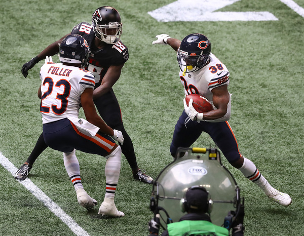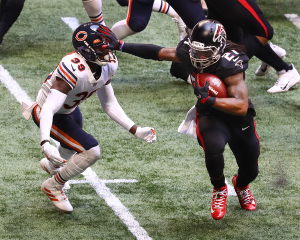 Atlanta Falcons running back Todd Gurley stiff arms Chicago Bears defensive back Eddie Jackson on his way to the endzone for a touchdown to take a 23-10 lead during the third quarter in an NFL football game on Sunday, Sept. 27, 2020 in Atlanta, GA. (Curtis Compton/Atlanta Journal-Constitution/TNS)