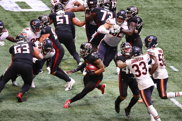 Atlanta Falcons running back Todd Gurley finds a hole through the Chicago Bears defense for a touchdown run to take a 23-10 lead during the third quarter in an NFL football game on Sunday, Sept. 27, 2020 in Atlant, GA. (Curtis Compton/Atlanta Journal-Constitution/TNS)