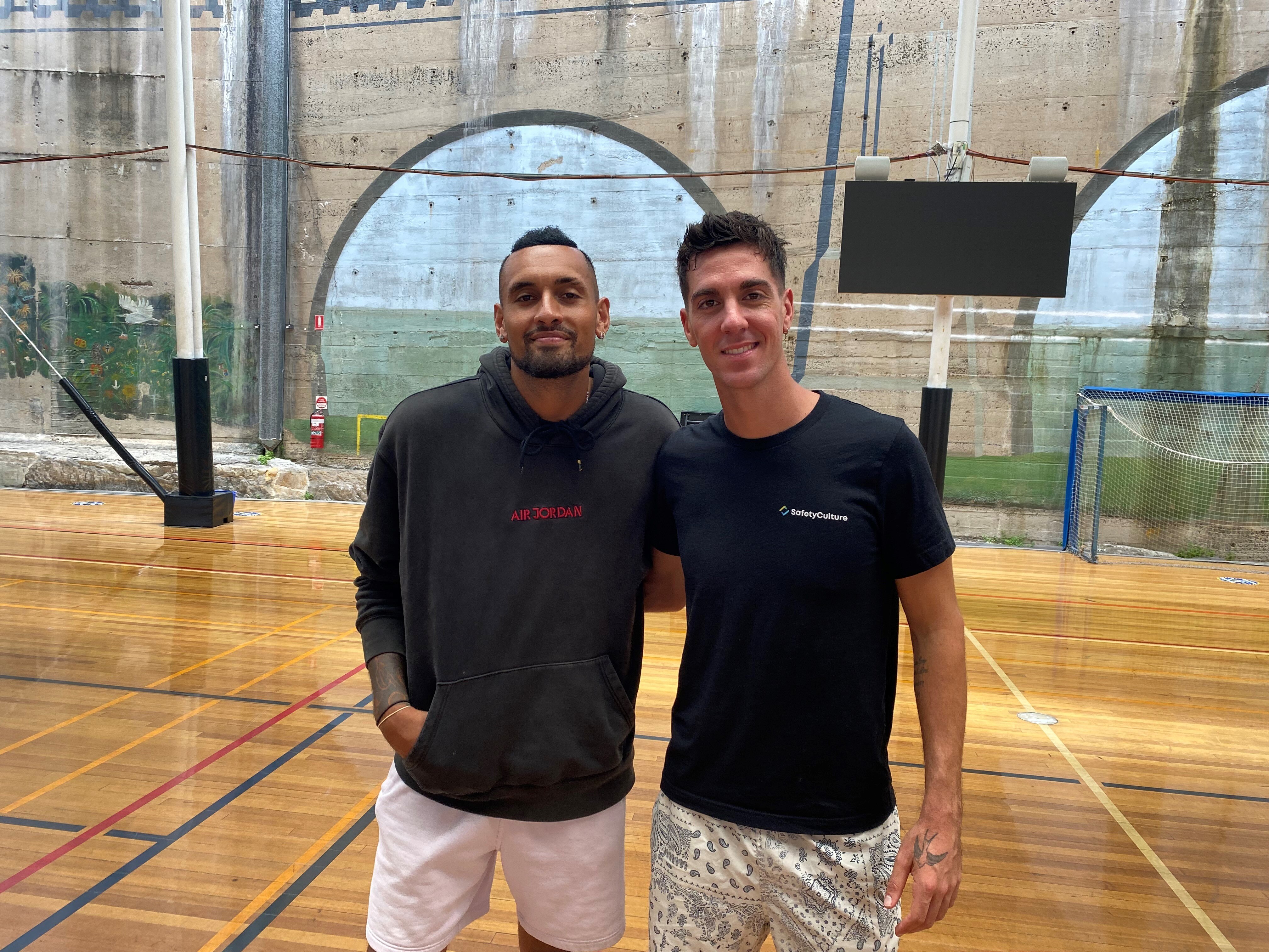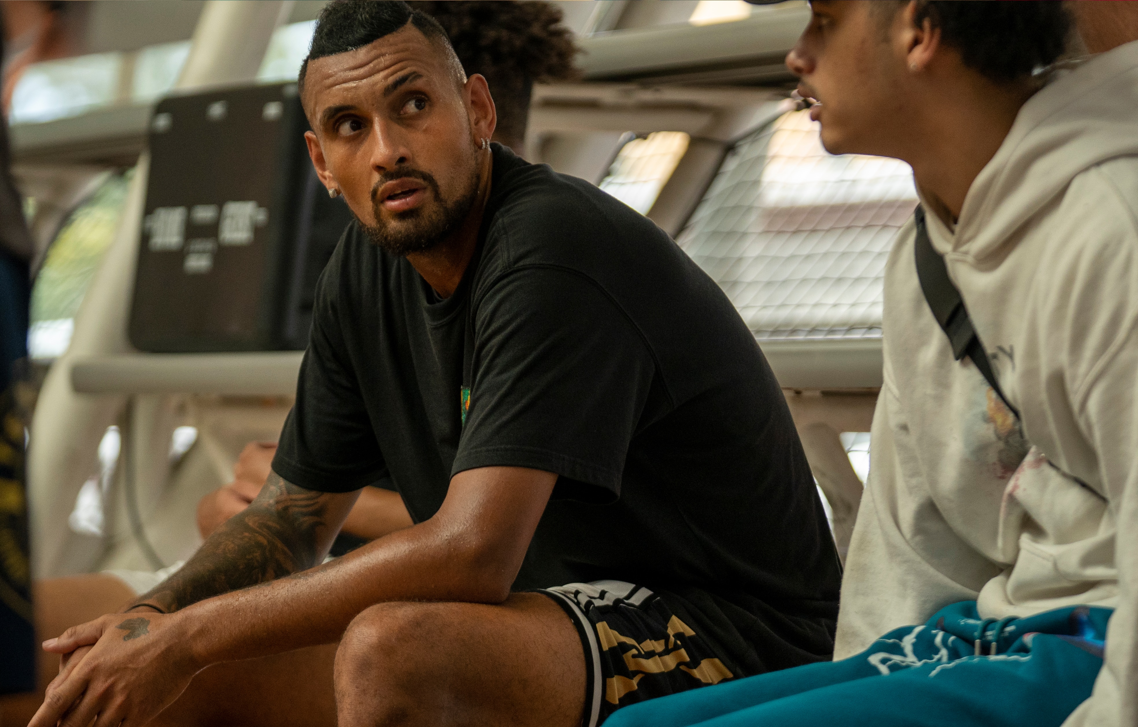 At an inconspicuous sports hall, nestled amongst the historic buildings surrounding Sydney Harbour, Nick Kyrgios is beaming as he runs up and down a basketball court with his mates.
