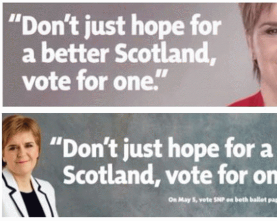 The First Minister of Scotland was attacked by the Scottish Labour Party for launching adverts with the slogan "Don't just hope for a better Scotland, vote for one", accompanied by a picture of her face.