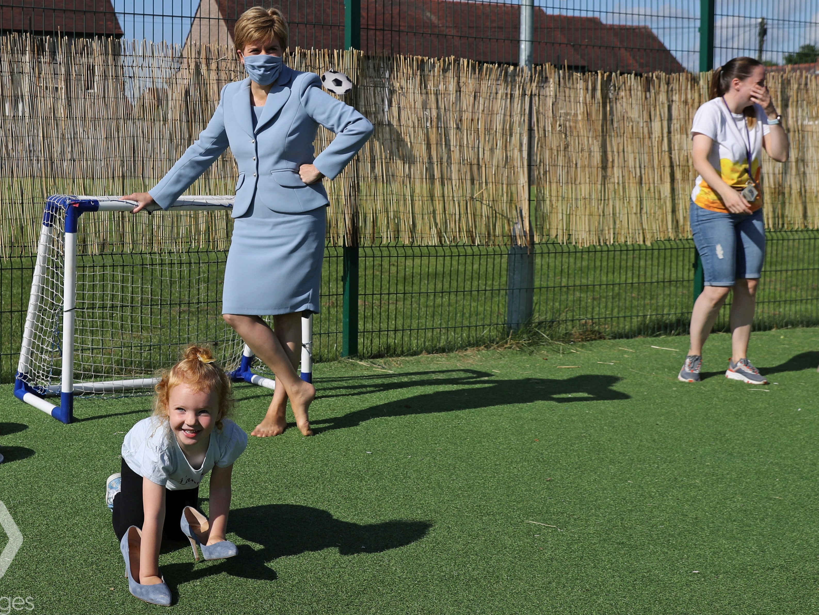 Scotland’s First Minister was cruelly robbed after she took her shoes off to stand on some Astroturf, during a trip to a nursery near Stirling in which she set out government priorities for early years education.