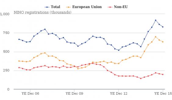 Figures released on Thursday put the annual rise in net long-term migration to the UK at a “not statistically-significant” 31,000 but recorded 828,000 NI number registrations for foreign citizens in 2015, up 8 per cent on the previous year.
